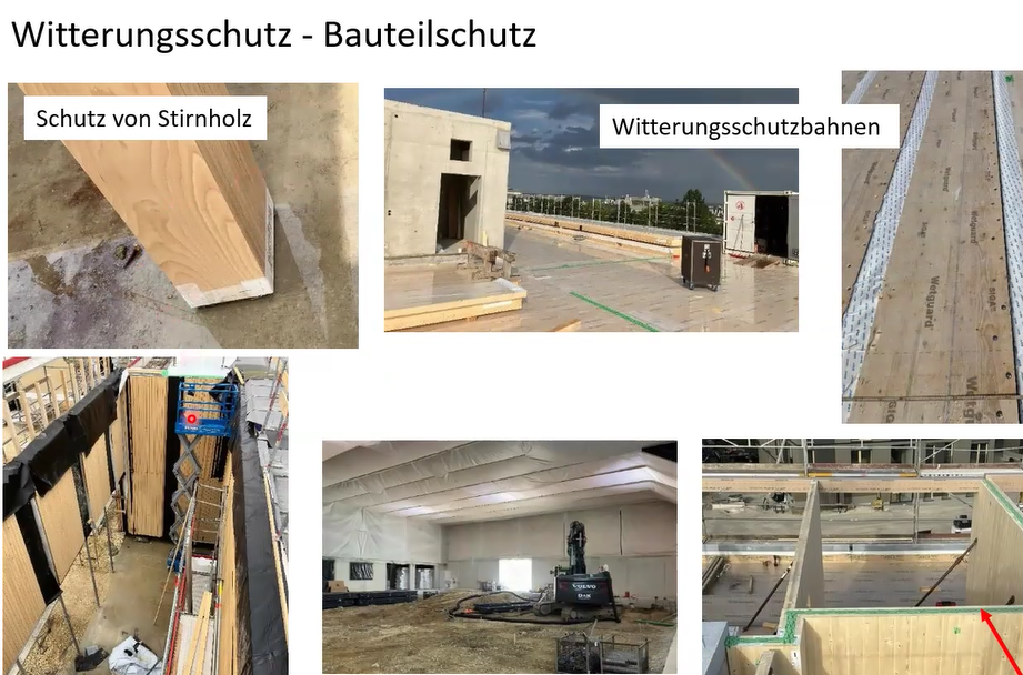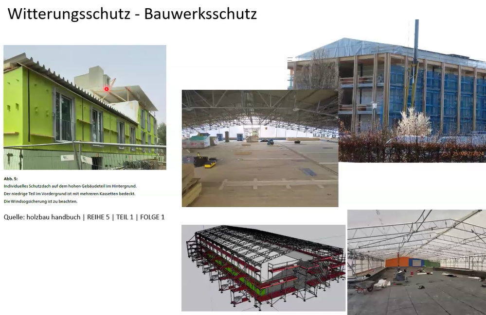 Was bedeutet überhaupt Witterungsschutz, und wie unterscheidet sich Witterungsschutz von Feuchtemanagement? Helmut König nahm die Teilnehmer mit auf eine Reise zu den „trockenen“, aber entscheidenden Details: Feuchtemanagement ist der übergeordnete Begriff, es erfasst jede Art von kritischer Feuchtigkeit oder Feuchteschaden. Der Witterungsschutz dagegen ist untergeordnet und umfasst den Schutz eines Bauteils vor Niederschlägen während der Bauphase. Der rechtzeitig geplante Witterungsschutz ist als notwendige Maßnahme komplett in den Montageablauf integriert. In diesem Zusammenhang ist es wichtig, die Begriffe Feuchteschäden und Baufeuchte genau zu kategorisieren: „Was „feucht“ und was „trocken“ ist, regeln oft vertragliche Vereinbarungen“, so König. Vieles spielt sich aber auch über stillschweigende Vereinbarungen ab – also ohne, dass eine Regelung existiert und die jeweiligen Vorstellungen von Auftraggeber und Auftragnehmer parallel ungeprüft nebeneinander existieren.