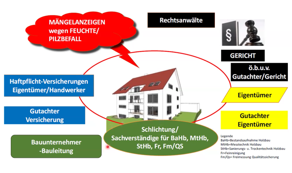 Kritische Holzfeuchte besteht dann, wenn ein Schaden entstehen kann und die Abnahme einer Bauleistung nicht möglich ist. Ein Feuchteschaden oder Mangel besteht dann, wenn es eine Abweichung von den Vereinbarungen gibt – ohne oder mit konkreten Sachschäden. Auch bei Begriffen wie Dachabdichtung, Notabdeckung oder Witterungsschutzbahn ist Genauigkeit bei der Verwendung geboten – um teils große Unterschiede der Anwendung in der Leistungsphase, im rechtlichen Sinn und bei den Kosten zu beachten. Eine wichtige Hilfestellung bietet hier das Regelwerk des Deutschen Dachdeckerhandwerks. König wiess dabei auf die großen Unterschiede zwischen früheren und heutigen Anforderungen am Bau hin – kurze Bauzeiten beim Holzbau, hohe Anforderungen und aktive Bauphasen auch im Winter bedingen schnelles, kostengünstiges und durch qualifizierte Kräfte ausgeführtes Feuchtemanagement. König: „Ohne eine qualifizierte Planung, Bauleitung und Ausführung kann das Bauen schnell zum finanziellen und gesundheitlichen Fiasko werden.“