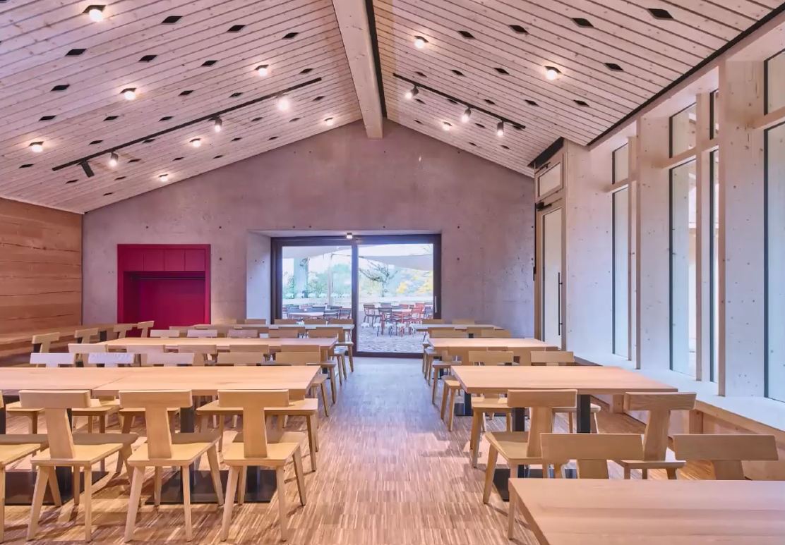 Statik, Schwindverhalten und Insektenbefall – Blockhäuser stellen an Bauprofis ihre ganz eigenen Herausforderungen. Gemeinsam mit der Zimmerei Fleck wurden Prototypen für die Blockbauwände entwickelt und gebaut. Bei einer Blockwand kann, abhängig von der Witterung, eine Setzung von 8 bis 10 Zentimeter innerhalb eines Jahres entstehen, wenn das Ausgangsmaterial nicht ausreichend getrocknet werden kann. Handelt es sich dabei um ein komplettes Blockhaus, setzt sich einfach alles inklusive Dach – problemlos. Setzt sich nur die Wand, muss eine Lösung gefunden werden. „Daraus entstand die Idee, die Baumstämme in der Mitte durchzusägen und eine mehrschichtige Blockwand aufzubauen, die dann bauphysikalisch ertüchtigt werden kann und das Gleitlager mit ausbildet“, so Lohrmann. Dieser Wandaufbaut hätte auch im Fall eines späteren Schädlingsbefalls Vorteile. Weitere Entwicklungen waren Stampfbetonwände und die Pfosten-Riegel-Fassade mit filigraner Ästhetik. Das Gebäude wurde im Oktober 2025 eingeweiht und konnte bei der Biennale in Venedig präsentiert werden.