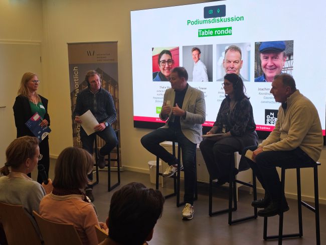 Bei der finalen Podiumsdiskussion, moderiert von Katharina Brockstedt von Envirobat Grand Est – energivie.pro, kamen Thalie Marx (Eurométropole Strasbourg), Grégory Towae (Girold), Arndt Kückenthal (WeberHaus GmbH & Co. KG) sowie Joachim Hörrmann (proHolzBW) ausführlich zu Wort. Der Fokus lag auf den Netzwerkaktivitäten der beiden Länder Frankreich-Deutschland, auf Innovationen im Holzbau, Vorfertigung und lokale Dynamiken. Das zweisprachige Rundtischgespräch thematisierte vorhandene Leuchtturmprojekte und konkrete Erfahrungsberichte von beiden Seiten des Rheins. Joachim Hörrmann von proHolzBW erläuterte im Kontext dazu die umfangreichen Handlungsfelder der Holzbau-Offensive BW und zeigte darüber hinaus zahlreiche Holz-Innovativbauten aus Baden-Württemberg auf. Thalie Marx betonte abschließend, „Der Markt der Zukunft ist die Sanierung mit Holz“.