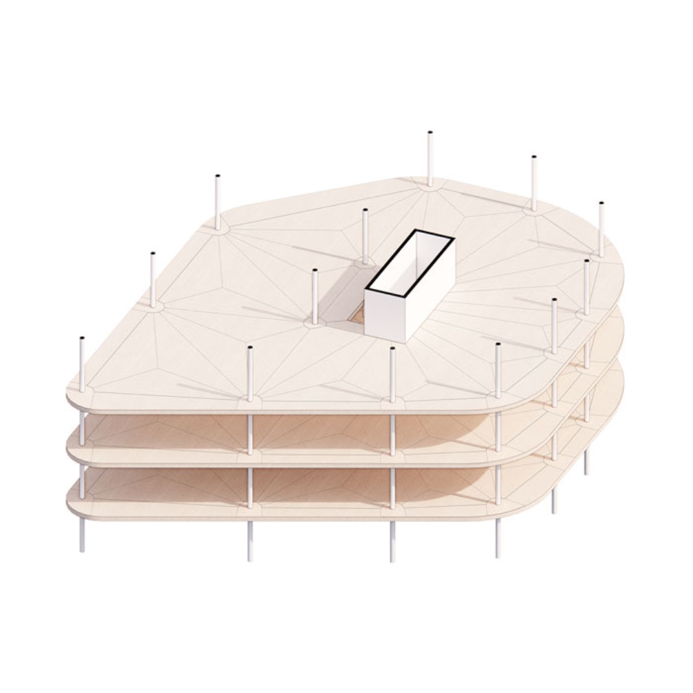 Nach vielen Jahren Forschungserfahrung in der Planung und Fertigung von Segmentschalen, deren Materialeffizienz sich an den Vorbildern der Natur orientiert, hat sich nicht zuletzt durch das Feedback aus der Industry der Schwerpunkt in der Forschung hin zum mehrgeschossigen Holzbau verlagert. Dort ist auch das Holzbausystem mit mehrachsig spannenden punktgestützten Holzdecken angesiedelt, welches beim künftigen Clustergebäude auf dem Campus in Vaihingen zum Einsatz kommen soll. Eine Weiterentwicklung / Variation des mehrachsig spannenden Deckensystems ist mit dem angewandten Forschungsprojekt „Universal Timber Slab“ im Rahmen des europäischen EIC-Pathfinder Programms dieses Jahr gestartet.