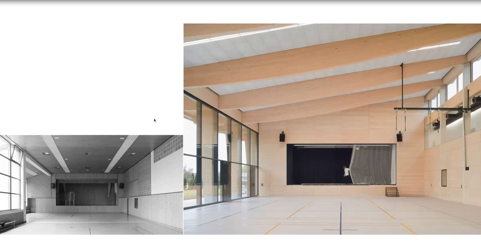 60 % des Bestands konnten erhalten werden, da die Traglasten auf die bestehenden Beton-Fundamente auflagern konnten. Bedarfsgerechtes Bauen bedeutet auch, dass Mauern neue Durchbrüche erhielten für Fenster oder Türen, wenn es notwendig war, und dort erhalten wurden, wo es gepasst hat. Auch im Innern wurde Bestand und Neubau so weit wie möglich miteinander abgestimmt, um eine neue Ästhetik zu schaffen: Die neue Sporthalle wurde in die Spange des Bestandes eingesetzt. Die Nutzräume und das Foyer wurden als Teil des Bestandes saniert und in den neuen Holzbau integriert.