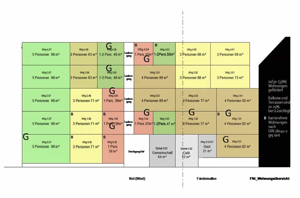Um die soziale Durchmischung sicherzustellen, wurden geförderte Wohnungen komplett mit nicht-geförderten durchmischt. Durch die starke Individualisierung der Wohnungsgrößen entsteht soziale Verflechtung, der Baugrund wird maximal ausgenutzt. Darüber hinaus wurden im Entwurf ein Café, ein Gemeinschaftsraum, Gästewohnungen und Außenanlagen eingeplant, um Orte der Begegnung zu schaffen.