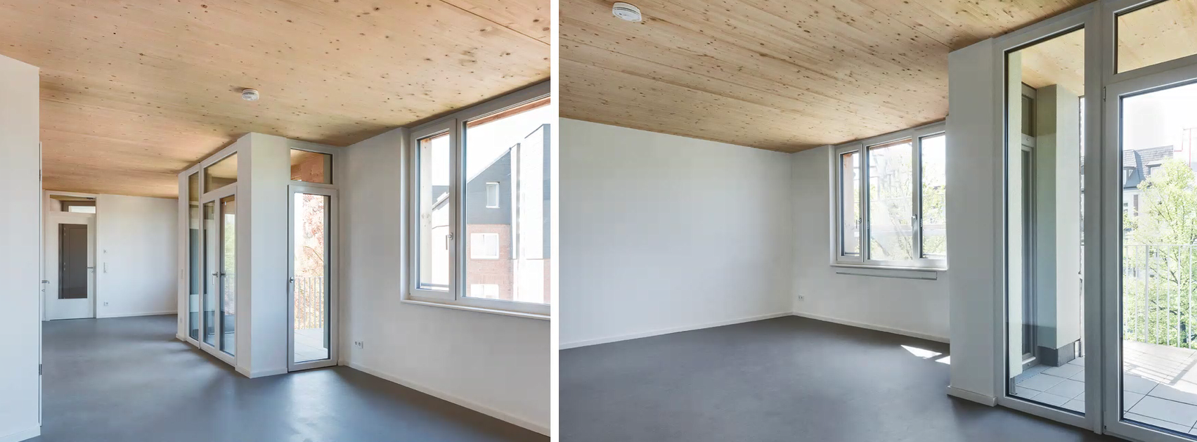 Der Keller, das Café und der Gemeinschaftsraum sowie die Treppenhäuser, die Brandwand zum Nachbarn und der Laubengang wurden aufgrund der Auflagen der Bauaufsichtsbehörden aus Stahlbeton errichtet. Aus Holz wurden sämtliche Decken, Wände, Stützen und Träger errichtet sowie das Dach. Es wurde nahezu genauso viel Holz wie Stahlbeton verwendet. Michel Eser hob dabei die Vorteile von Brettsperrholz (CLT) für den urbanen Wohnungsbau hervor – die hohe Präzision bei der Verarbeitung, eine schnelle Bauzeit, mehr Wohnraum und geringeres Gewicht, was auch beim urbanen Kernthema Nachverdichtung oft entscheidend ist. Dazu kommen die möglichen CO2-Einsparungen. Auch die Loggien wurden mit auskragenden Brettsperrholzdecken realisiert.