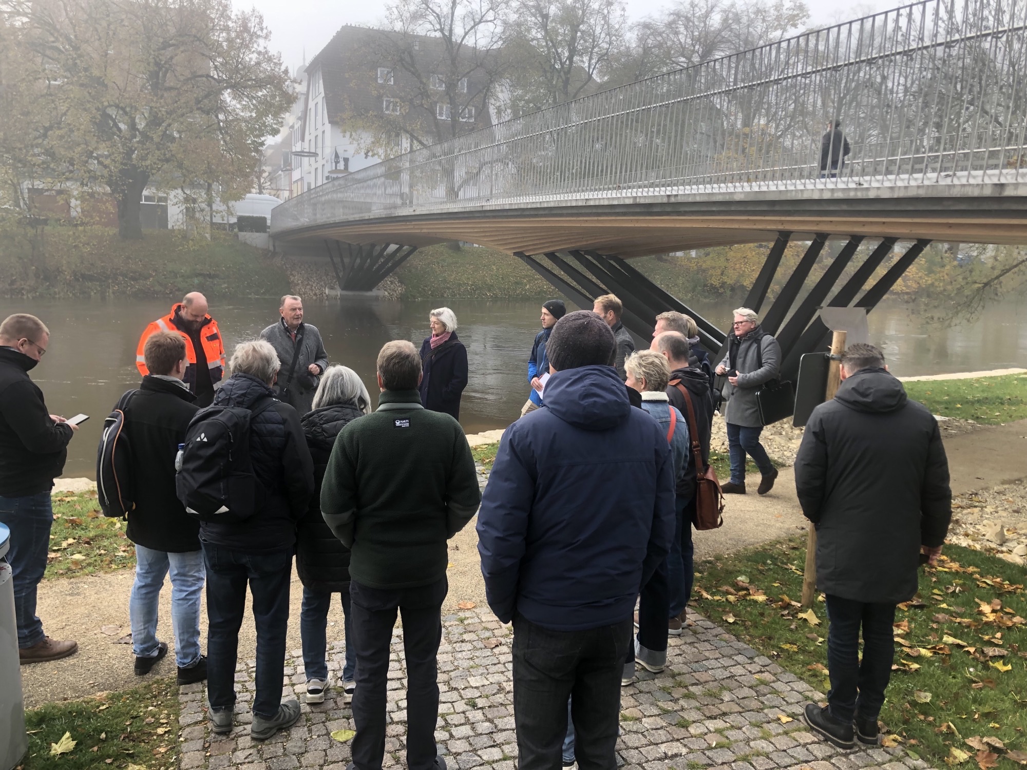 Die Tour begann mit der Besichtigung des Rathausstegs in Tuttlingen. Die beeindruckende Deckbrücke für Fußgänger und Radfahrer zeichnet sich durch eine innovative und semiintegrale Tragwerkslösung, materialgerechte Detailgestaltung sowie eine wartungsarme Konstruktion aus. Eine sorgfältige Konzeption durch die Tragwerksplaner Schlaich Bergemann Partner sowie von Architekturseite, Birk Heilmeyer und Frenzel Architekten, bildete die Grundlage für ein dauerhaft robustes Tragwerk in Form eines blockverleimten Brettschichtholzkörpers. Die Stützen wurden als schlanke Bauteile aus Stahlblechen konzipiert und stellen zusammen mit dem gefächerten Träger eine für den Landschaftraum prägende Einheit dar.
