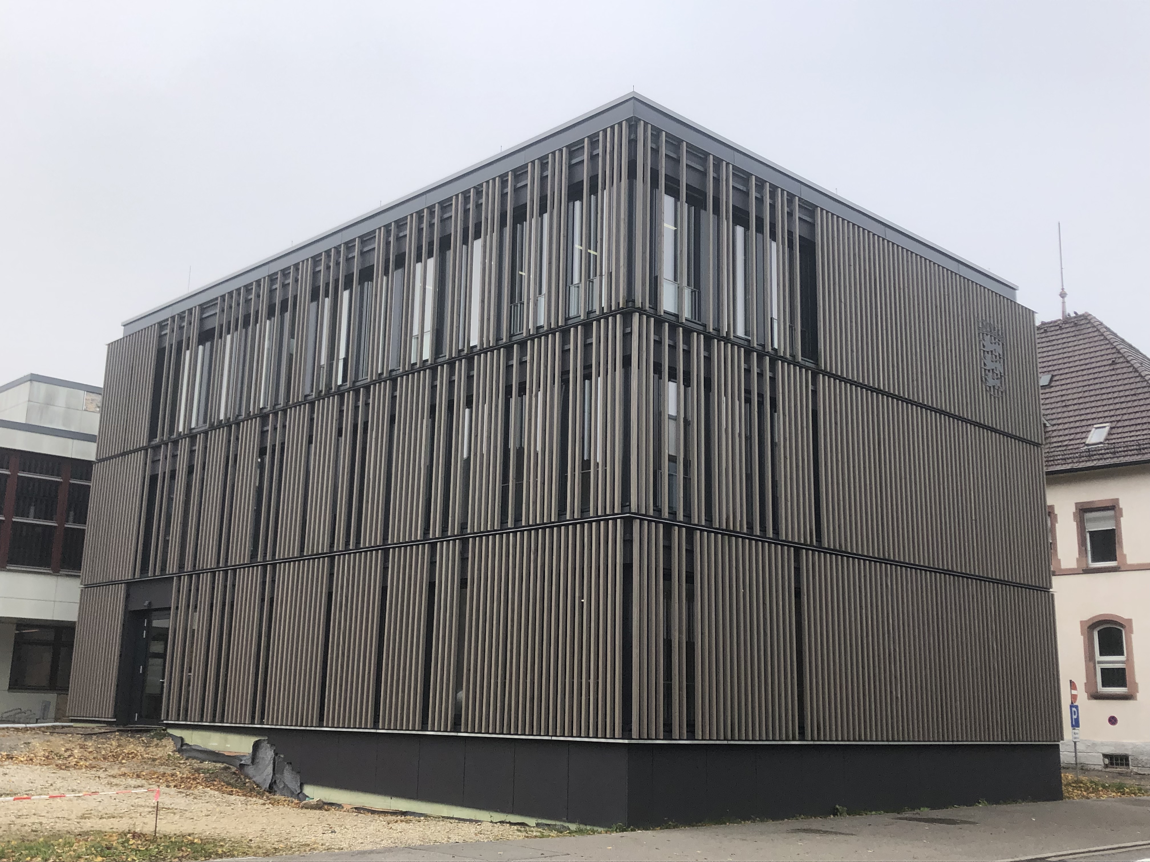 Die zweite Station war der neue Amtsgericht-Anbau in Tuttlingen. Michael Scheuerer, Geschäftsführer von Michel + Wolf Architekten sowie Beate Philipp, Direktorin des Amtsgerichts, stellten den 3-geschossigen Erweiterungsneubau mit Gerichtssälen und Verwaltungsräumen in Holzbauweise ausführlich vor. Die Wände wurden als Brettsperrholzelemente hergestellt, die Decken mit vorgefertigten kastenförmigen Flächenelementen aus Holz und Einzellängen bis zu 7 Metern. Das äußere Erscheinungsbild ist geprägt von einer Holzfassade mit vertikalen Holzlamellen, welche im Bereich der Öffnungsflügel zusätzlich als absturzsicherndes Element dient.