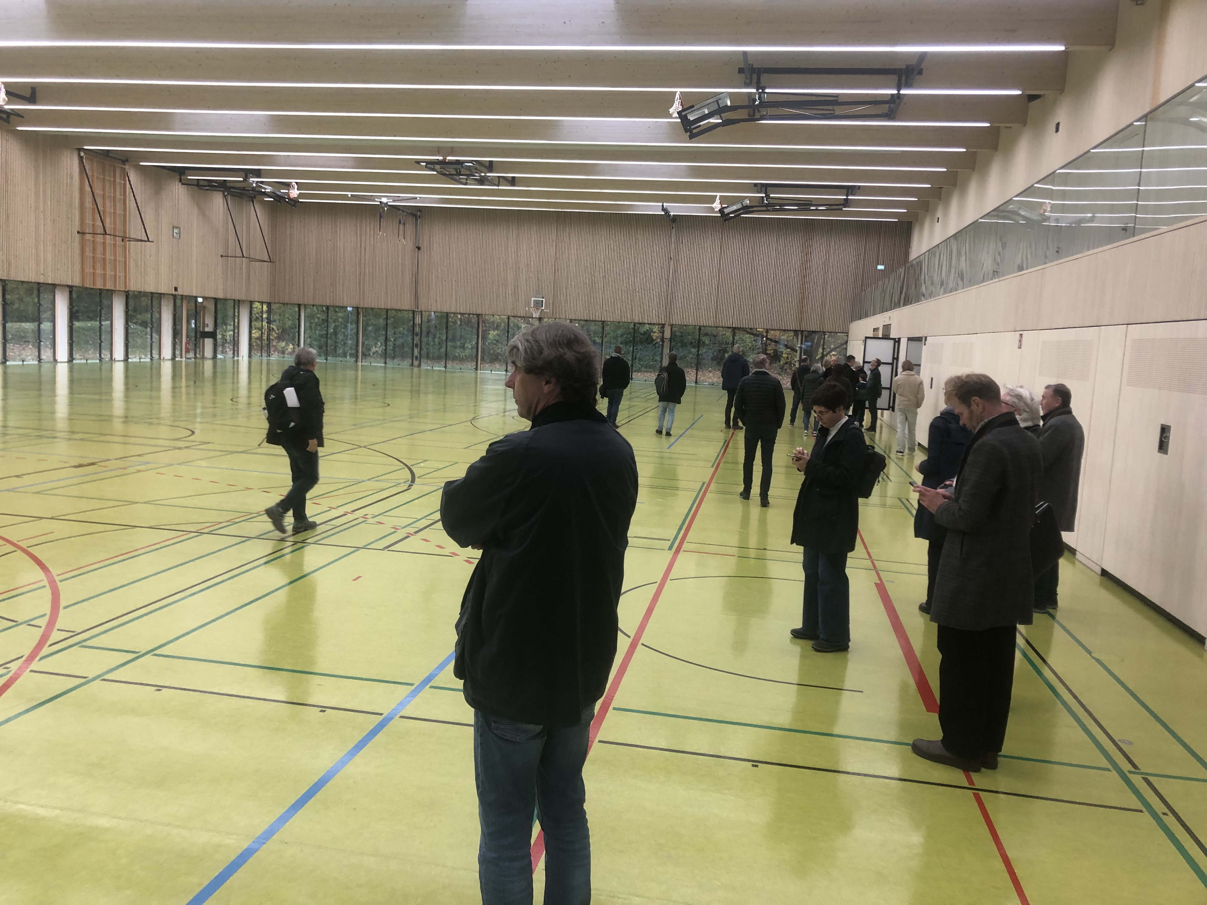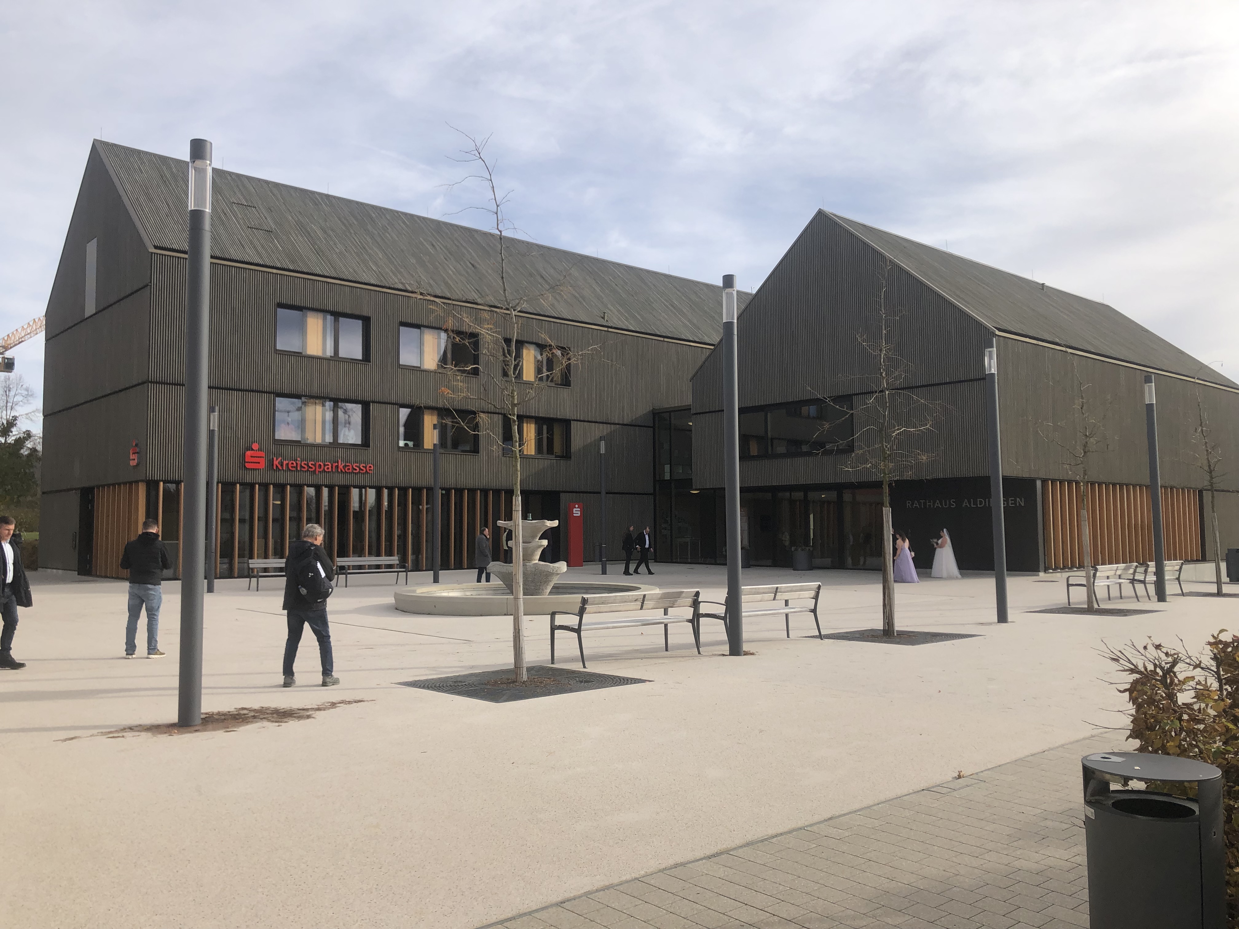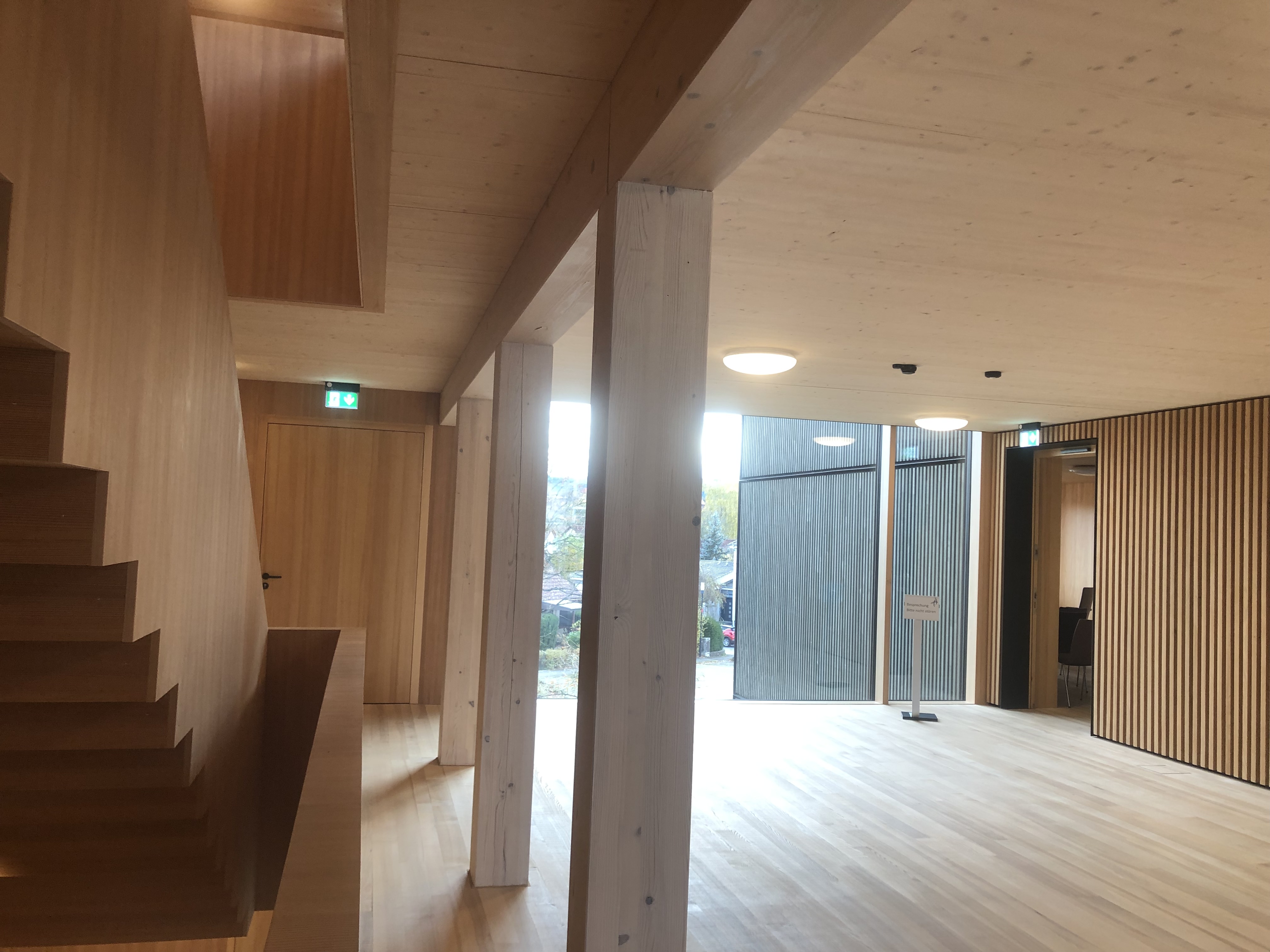 Nach der Mittagspause auf dem Dreifaltigkeitsberg folgte mit der Besichtigung des Rathaus Aldingen ein weiteres innovatives Holzbaukonzept. Unter der Leitung der BJW Architekten sowie den Tragwerksplanern merz kley partner, entstand das neue Leuchtturmprojekt in Holzbauweise zwischen 2021 und 2023. Es besteht aus zwei miteinander verbundenen Gebäuden, ein Bau für die Verwaltung sowie der zweite für ein Bürgerbüro, ein Foyer und einen Sitzungssaal. Die Holzbaukonstruktion besteht aus einer tragenden Weißtannen-Brettschichtholz bzw. -Brettsperrholz-Struktur. Die Geschossdecken der Obergeschosse sowie das Dachfaltwerk des Sitzungsbereichs wurden aus Brettsperrholz mit einer Elementstärke bis zu 22 cm ausgeführt. Alle Außenwände konnten als vorgefertigte Holzbauelemente vor Ort montiert werden. Die Fassade zeichnet sich durch eine Holz-Lückenschalung aus, das Dach hingegen wurde mit beschichteten Stehfalztafeln eingedeckt. Durch den konsequenten Holzbau konnte mit hoher Wirtschaftlichkeit eine große räumliche Steifigkeit über Dach und Wandscheiben hergestellt werden.