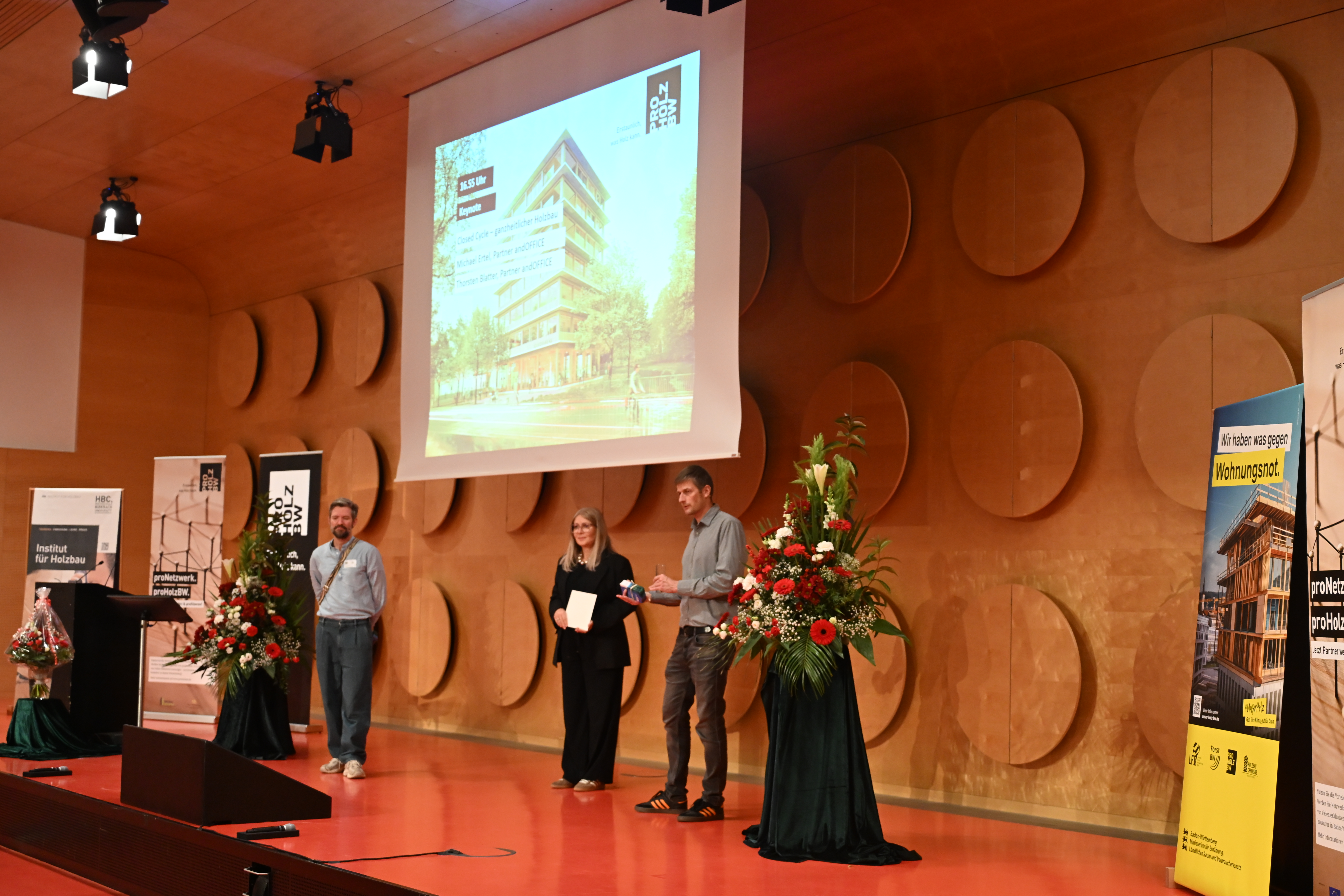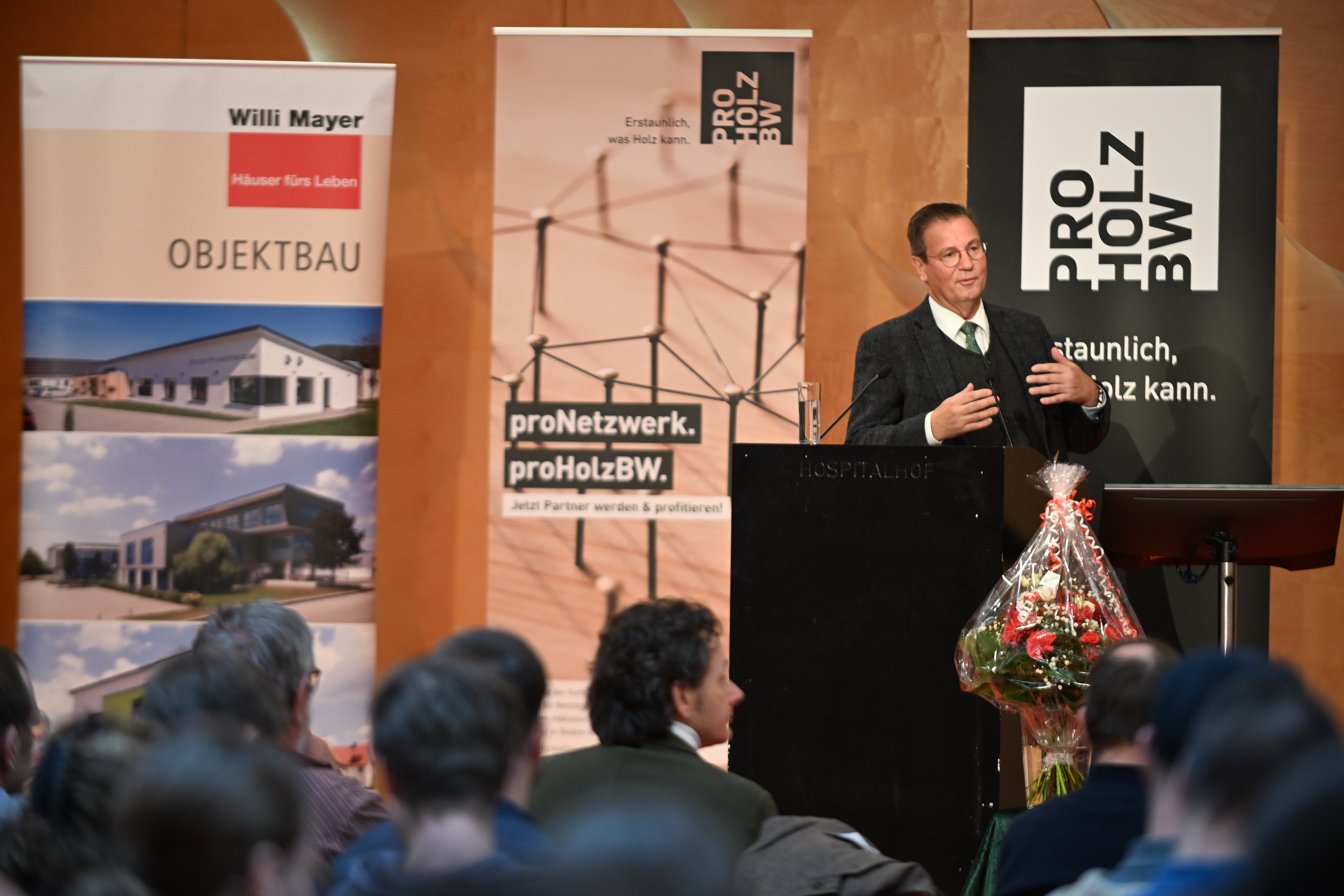Uwe André Kohler, Geschäftsführer von proHolzBW, eröffnete die Fachtagung mit Fakten und Zahlen zum Holzbau: Baden-Württemberg ist immer noch Holzbau-Bundesland Nummer 1 in Deutschland, mit einer Quote von 39 % vor allem im Wohnungsbau. Doch es gibt in vielen Bereichen noch Luft nach oben, von bezahlbarem Wohnbau bis hin zum Gewerbebau in Holzbauweise: „Ich hoffe, dass wir mit dem Bauturbo auch im Bereich des Holzbaus positive Resonanz haben werden“, so Kohler zu den aktuellen Entwicklungen in der Branche. Auch der Generalsponsor, Willi Meyer von Willi Meyer Holzbau, begrüßte die Tagungsgäste.