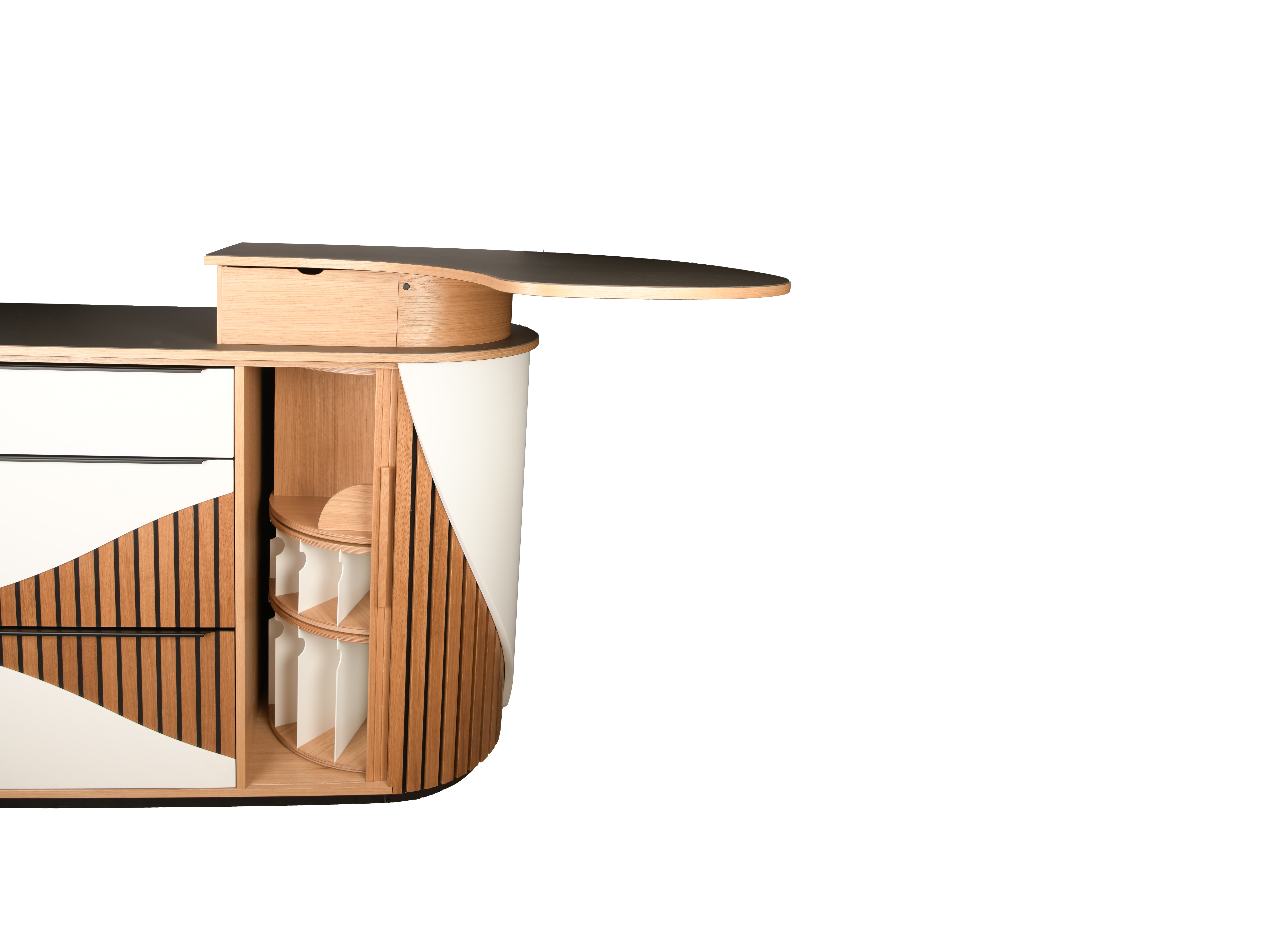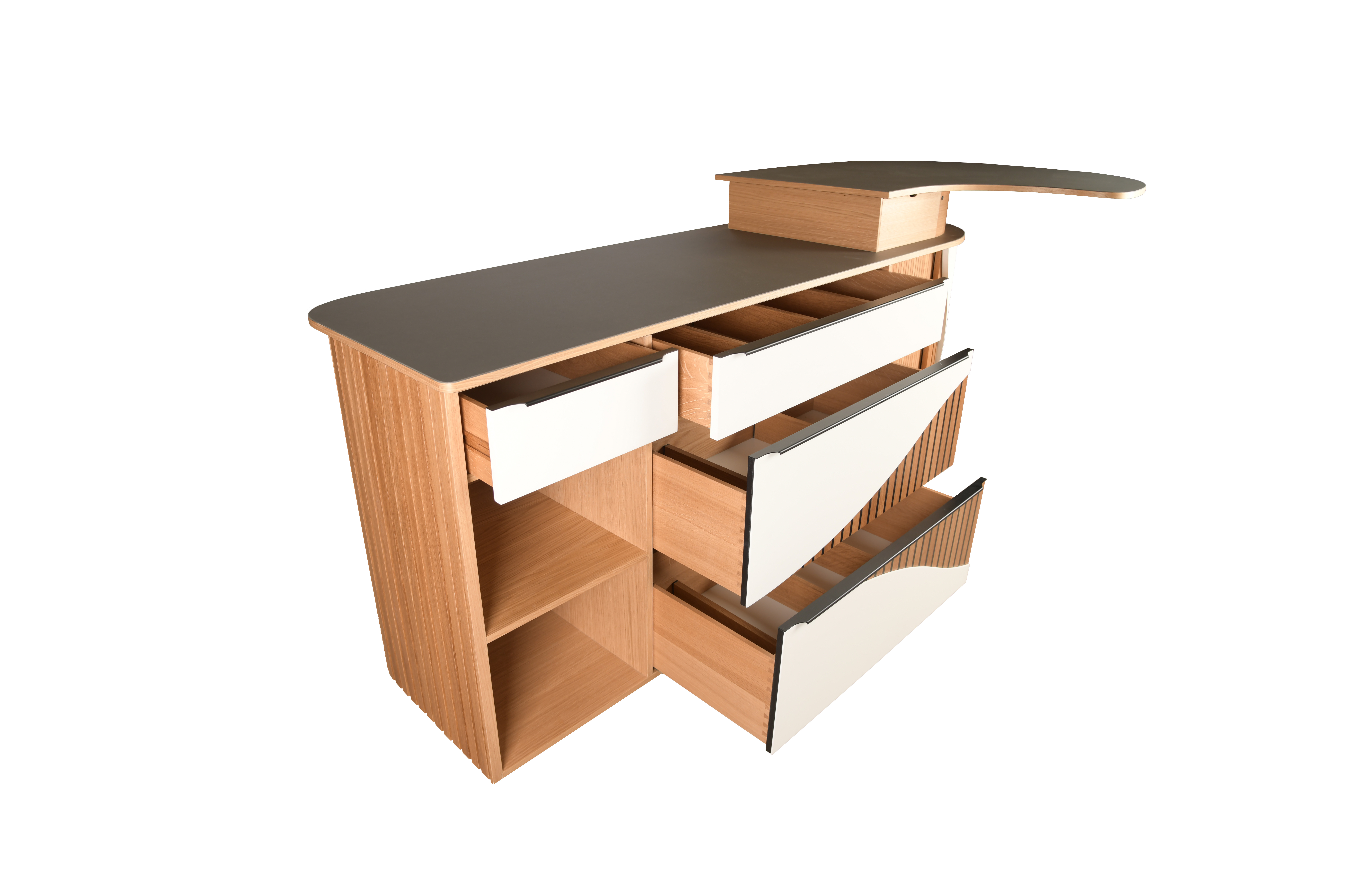 Im Inneren befinden sich drei mechanisch geführte Schubkästen sowie ein weiterer Schubkasten mit klassischer Kulissenführung.