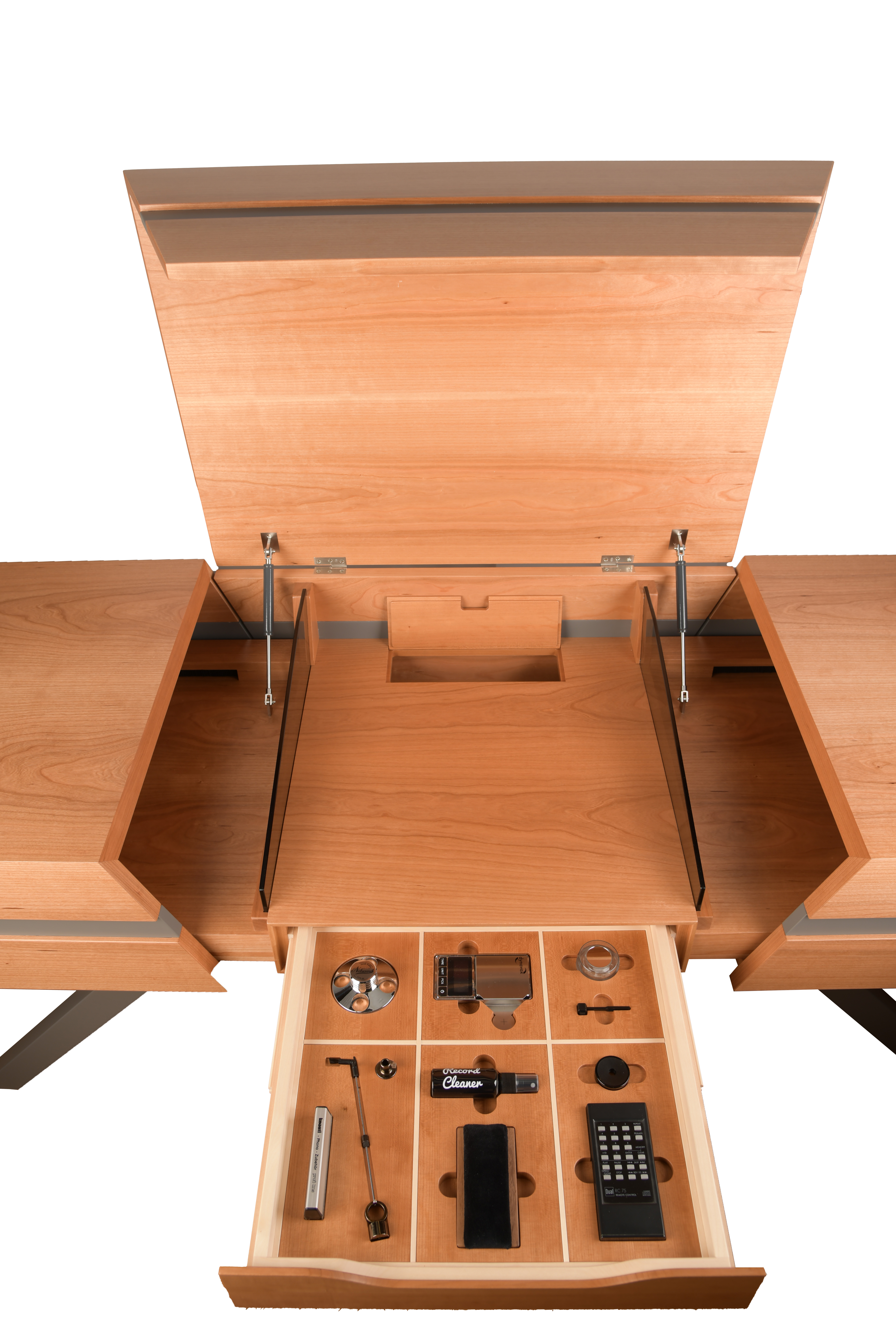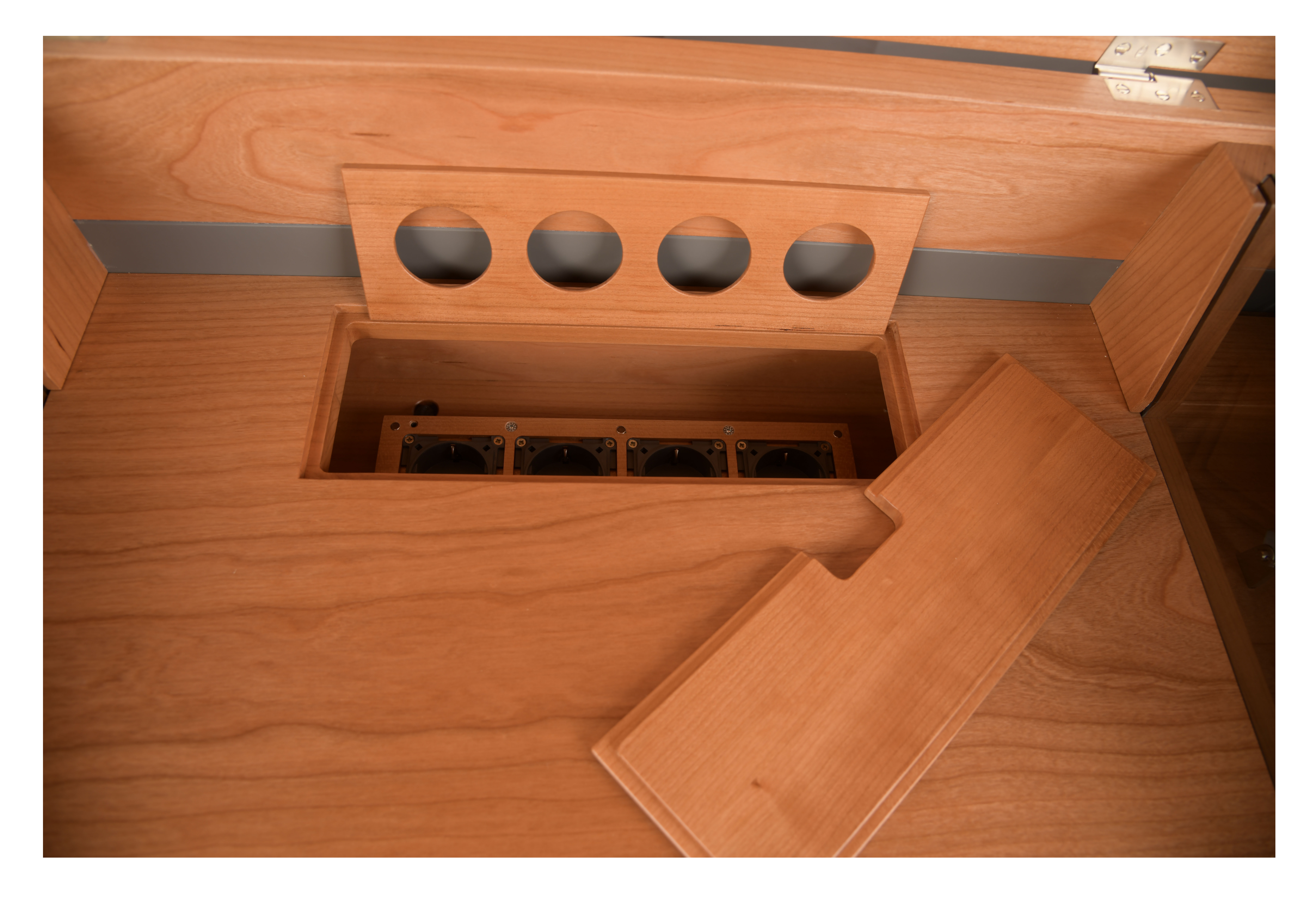 Eine Klappe und zwei seitlich laufende Schiebeelemente lassen Technik dezent verschwinden