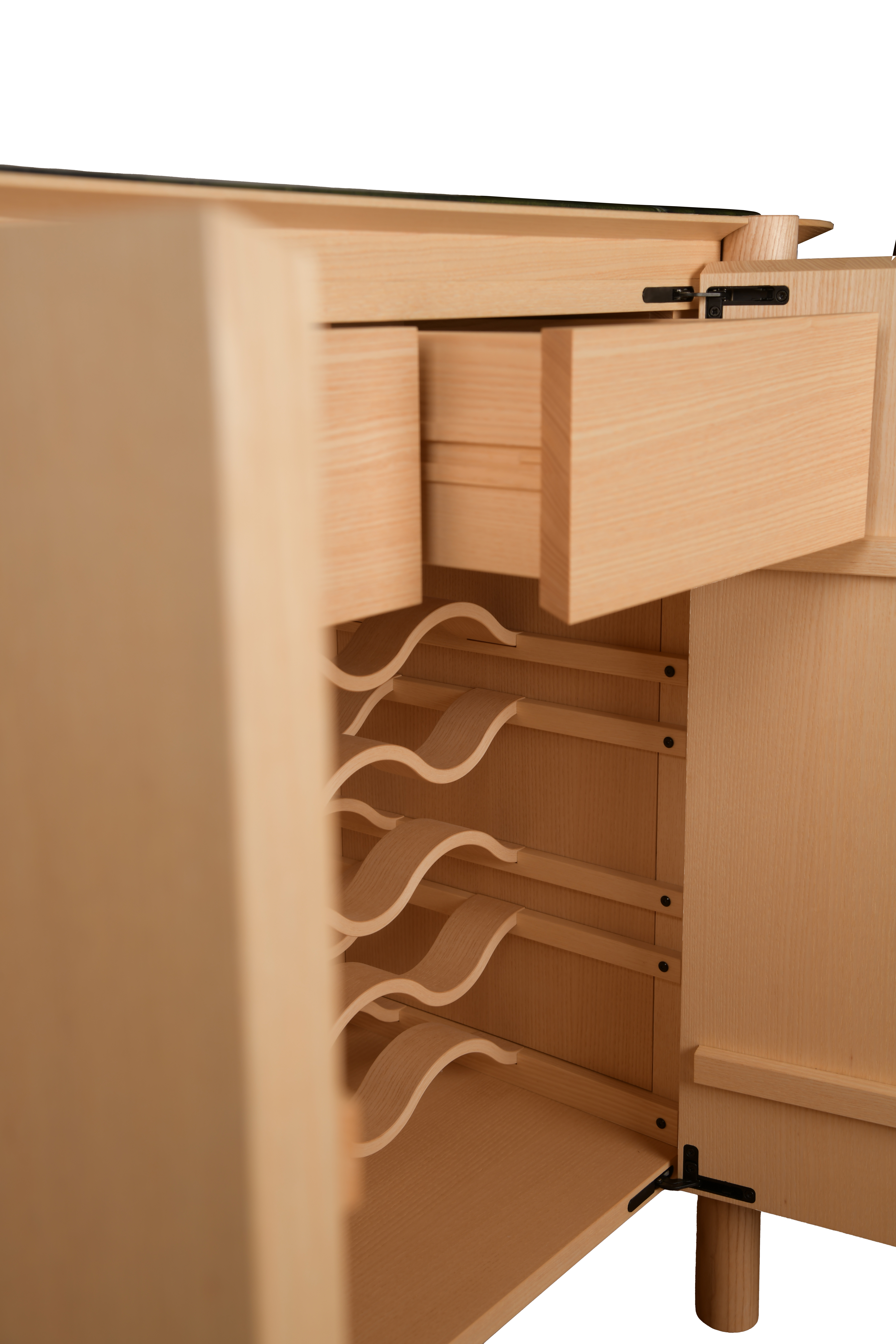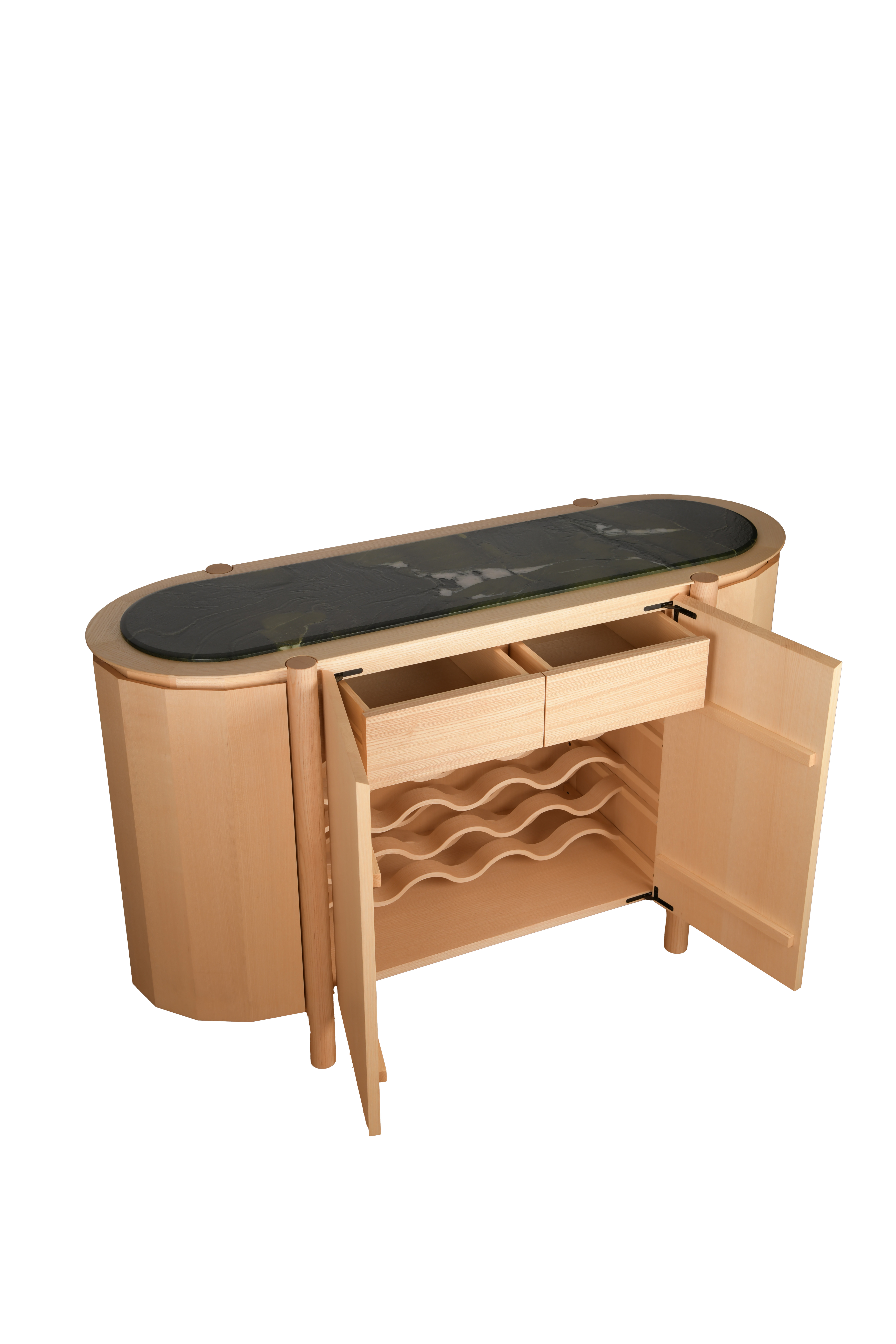 Im Zentrum bietet sie großzügigen Stauraum für Weinflaschen und Zubehör, während Gläser elegant in den achteckigen Türen hängen.