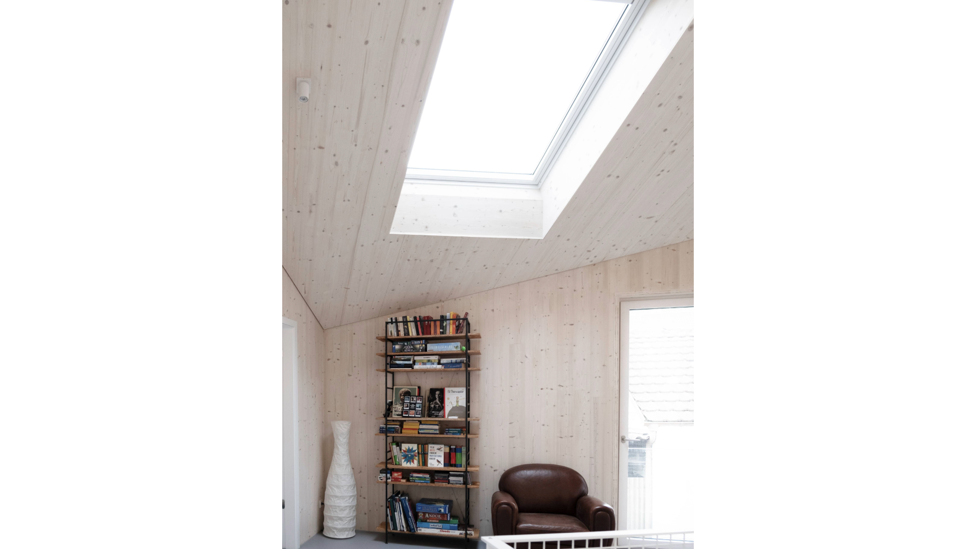 Generell ist der Fensterflächenanteil hoch und ermöglicht tagsüber lichte Räume und begrenzt somit den Bedarf an Kunstlicht. Vier große Dachflächenfenster durchfluten das Obergeschoss mit Tageslicht, welches über die Treppe ihren Weg in das Erdgeschoss findet und somit die Räume vertikal verbindet. Im Erdgeschoss sorgen drei große Fensterflächen für ein weites Raumgefühl und verwischen den visuellen Eindruck von Innen- und Außenraum. Die hohen Decken sowie ein gezielt gesetztes Rundfenster verleihen den Räumen Großzügigkeit und Charme. Das Wohnhaus wird so zum Beispiel dafür, wie mit gezielt gesetztem Tageslicht auch auf kleinem Raum ein großzügige Atmosphäre geschaffen werden kann.