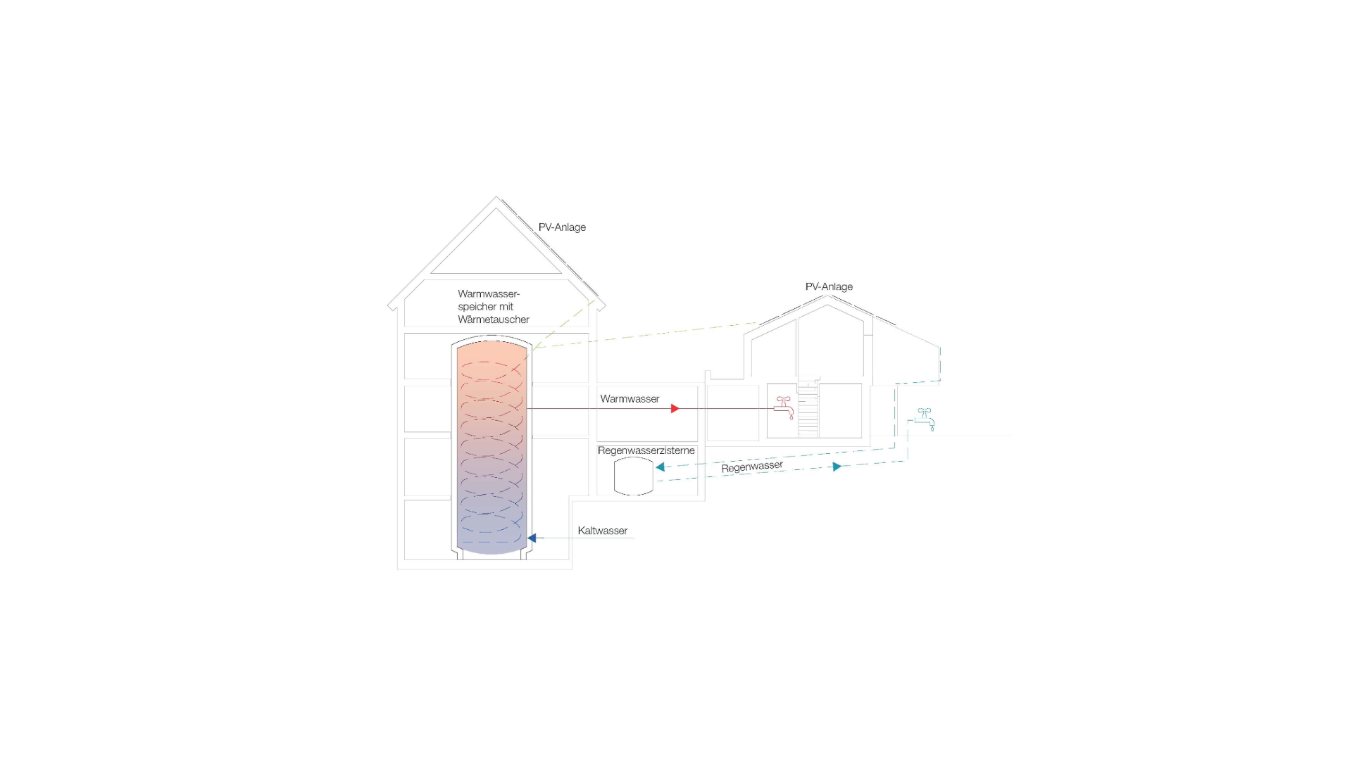 Über die Garage ist das Gebäude mit dem Nachbargebäude verbunden, in dem ein großer Wärmespeicher steht. Beide Häuser können so nachhaltig über Photovoltaikanlagen geheizt werden. Die Verwendung von nachwachsenden Rohstoffen trägt ebenfalls zu einem ökologischen Gesamtkonzept des Hauses bei. Holz als Wand- und Fassadenoberflächen ergeben eine behagliche Atmosphäre im Innenraum und ehrliche, sich durch die Witterung ändernde Ansichten im Außenraum.
