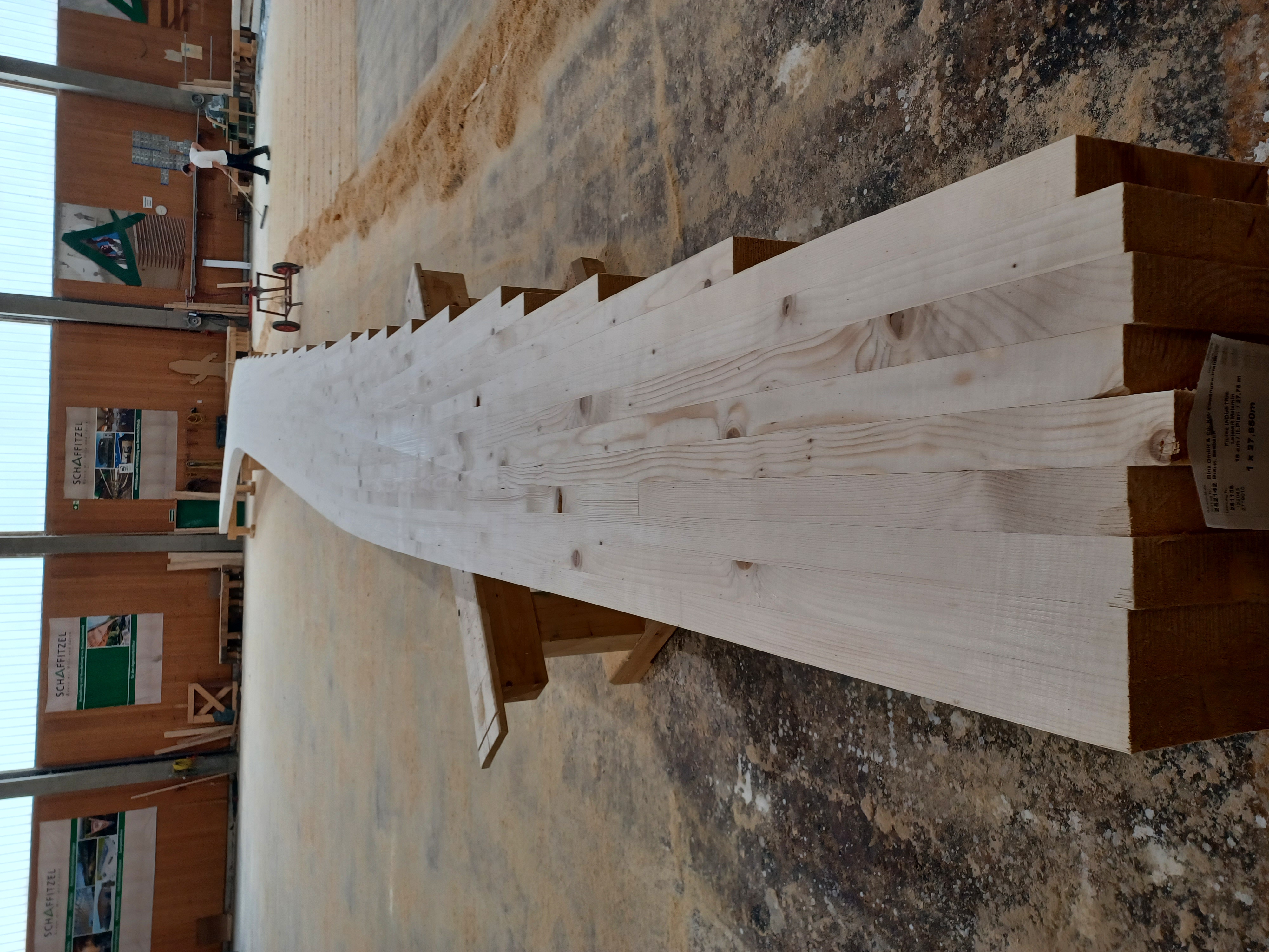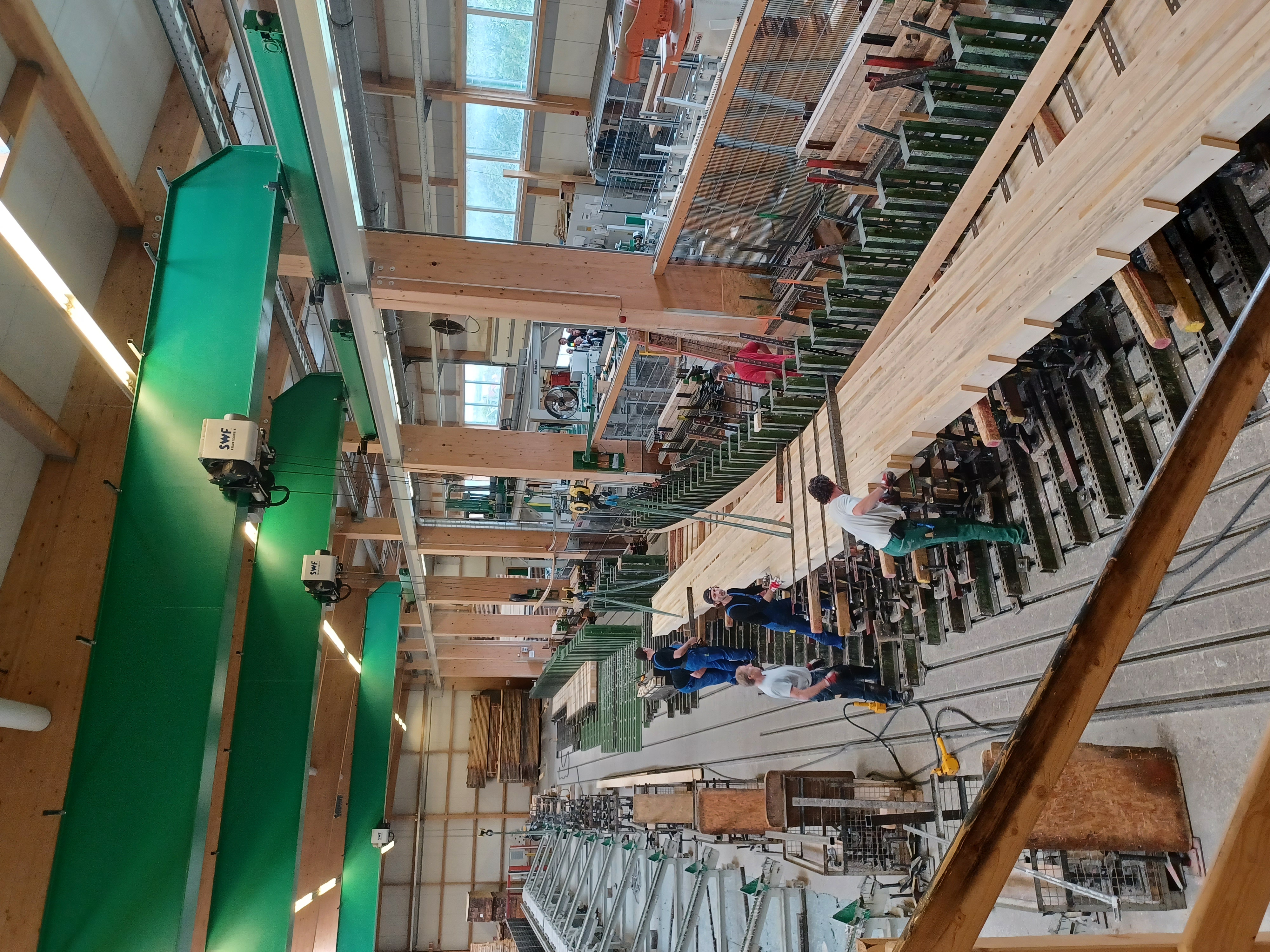 In der firmeneigenen Brettschichtholz-Produktion werden Bauteile von bis zu 45 Meter Länge hergestellt, vor allem aus Fichte, aber auch in Sonderholzarten wie Buche, Kiefer, Lärche, Douglasie oder Accoya. Die Bauteile entstehen in verschiedenen Festigkeits- und Feuerwiderstandsklassen. In den beiden Pressen können je nach Bedarf gerade, einfach oder mehrfach gekrümmte oder verdrillte Bauteile entstehen. Die Teilnehmer konnten beobachten, wie aktuell ein Element in die Presse für gekrümmte Bauteile eingespannt wurde. Weiter ging es in den Abbund und eine Halle für die Herstellung von Holzbrückenbauelementen, in der zum Beispiel blockverleimte Elemente für den Holzbrücken besichtigt werden konnten.