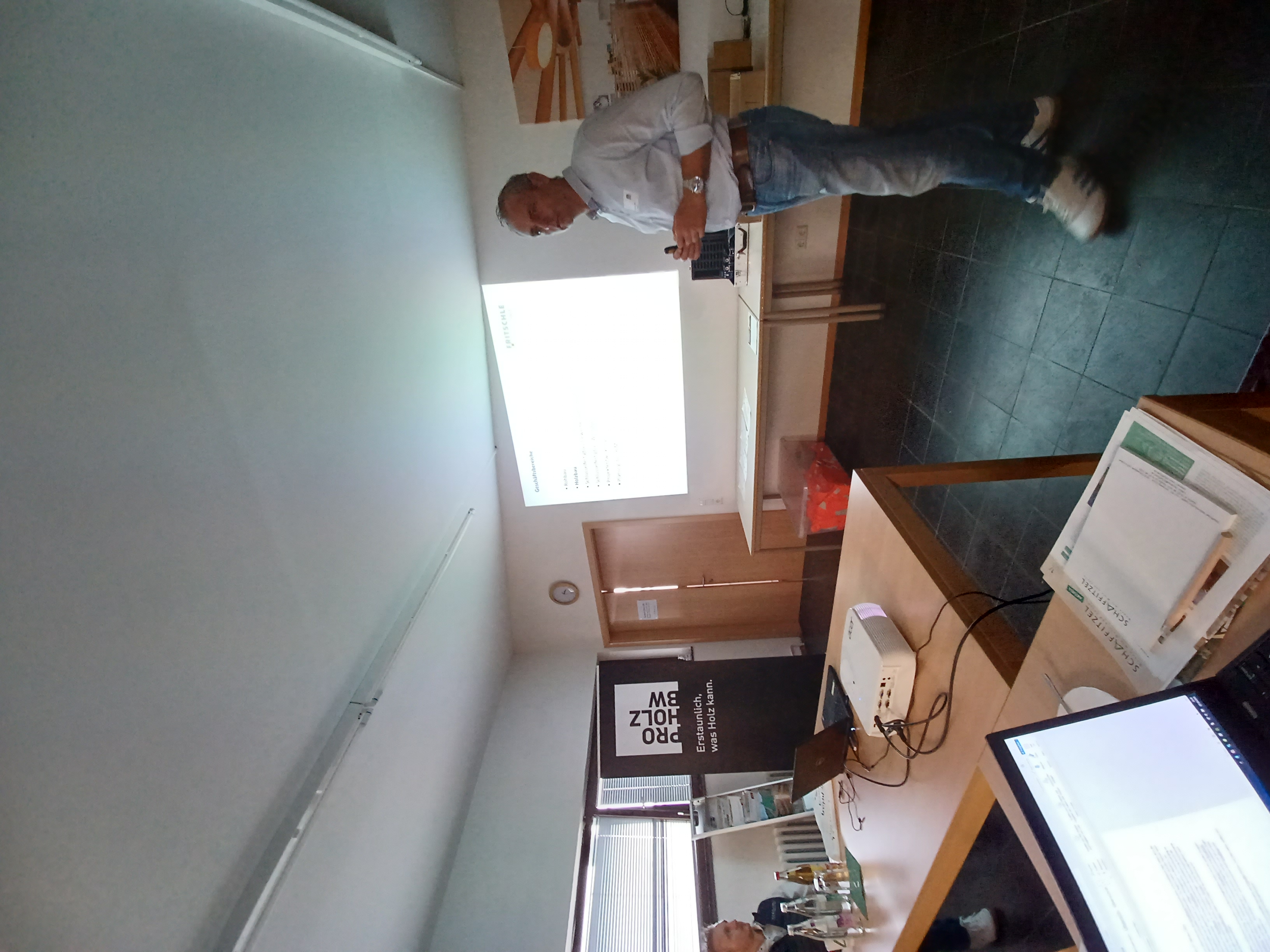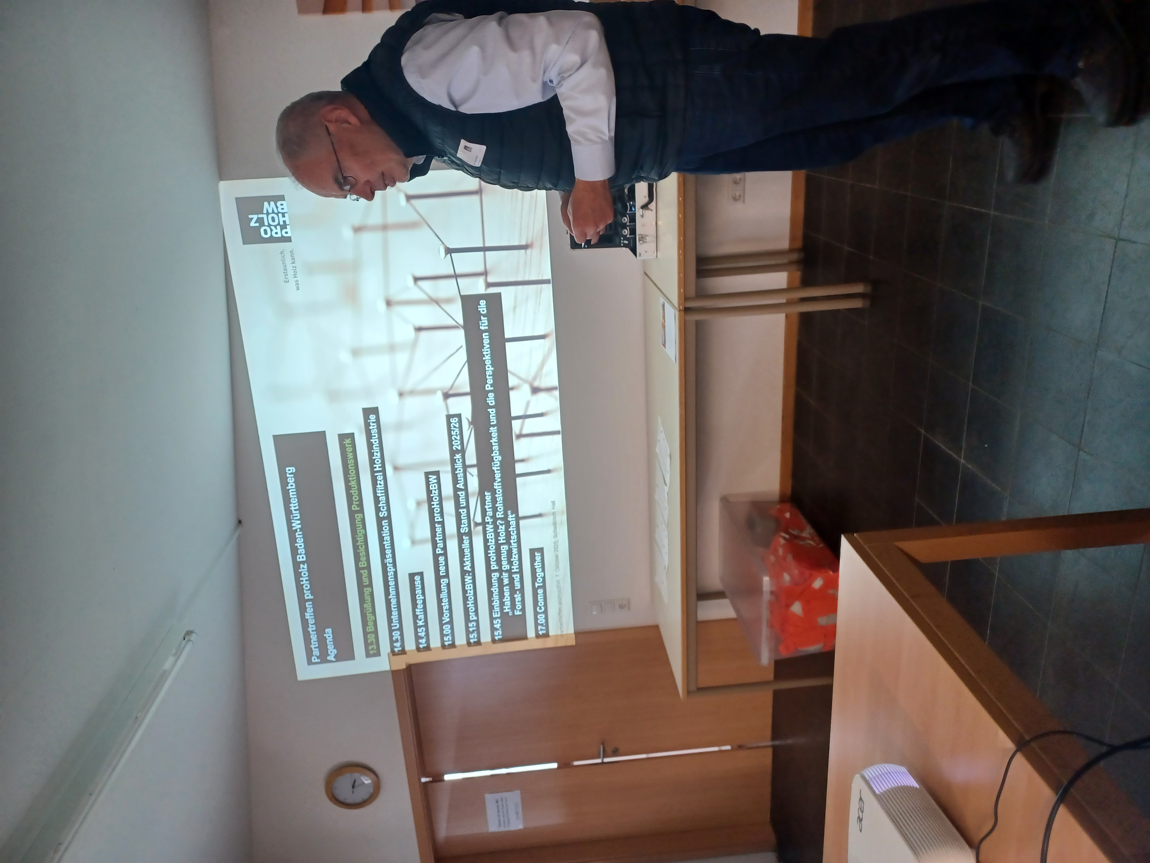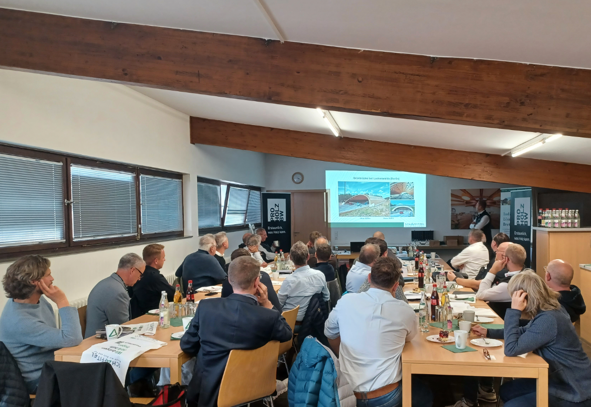 Bei Kaffee und Kuchen in der Kantine des Betriebsgeländes trafen sich die Gruppen wieder zum ersten Vortrag, der Präsentation der Firma Schaffitzel durch Jörg Schaffitzel, Geschäftsführer des in der 4. Generation in Familienhand liegenden Unternehmens. Im Anschluss präsentierten sich neue Unternehmen im proHolzBW-Netzwerk. Christoph Fritschle von Fritschle Holzbau aus Uttenweiler stellte sich vor und präsentierte Produkte und Beispielbauten, er verwies zudem auf das 80-jährige Firmenjubiläum im Jahr 2026.
