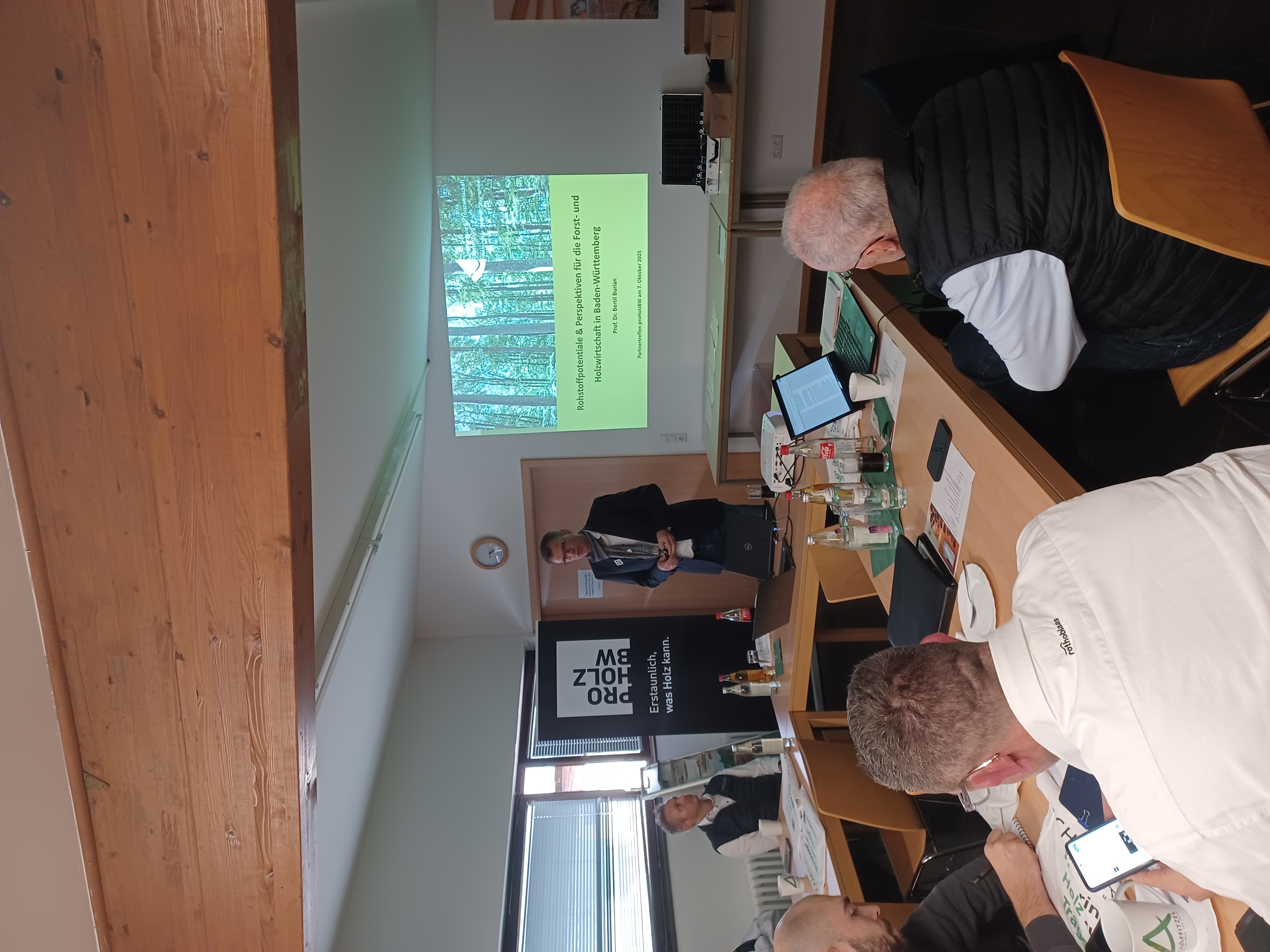Prof. Bertial Burian von der Hochschule Rottenburg präsentierte neueste Forschung und Fakten zu Rohstoffpotentialen und Perspektiven für die Forst- und Holzwirtschaft in Baden-Württemberg. Mit Hintergrundinformationen zur Bundeswaldinventur und dem Vergleich Land-Staat stieg Burian in seine Präsentation ein. Prof. betonte vor allem die Bedeutung der Waldverjüngung: „Es gibt einen Anteil von 11,2 % Kleinprivatwald in Baden-Württemberg – ein Potential, um das wir uns kümmern müssen.“ Generell liegt das Bundesland im deutschlandweiten Vergleich vorne, was den Waldumbau und die Waldverjüngung angeht. In Baden-Württemberg wachsen pro Jahr im Durchschnitt 1,5 Vfm/ha/a mehr nach als in ganz Deutschland. Prof. Burian wies auch auf die Bedeutung der Bewirtschaftung der Wälder im Hinblick auf die CO2-Speicherung hin – wird nichts entnommen von dem nachwachsenden Holz, entsteht zu viel Totholz, wie zum Beispiel im Nationalpark Nordschwarzwald, und der Wald wird zur gerne zitierten „CO2-Schleuder“. Prof. Burian beantwortete auch die große Frage nach der Holzverfügbarkeit – denn es ist ausreichend Holz für die wirtschaftliche Verwendung vorhanden – es gibt sowohl genug Vorräte, auch wächst der Wald schnell genug, um nachhaltig mehr mit Holz zu bauen. Gleichzeitig hat sich die Zusammensetzung der Wälder verändert: Während in Baden-Württemberg 50 % des Holzvorrats auf Fichte und Tanne entfallen, sind dies deutschlandweit Fichte und Kiefer. Das zukünftige Rohholzpotential auf Ebene des Bundesgebiets beträgt rund 80 Milliarden Kubikmeter pro Jahr, davon entfallen 41 % auf die Fichte und 30 % des Rohholzpotentials auf die Buche. Das heisst auch, dass eine weitere Steigerung der Holzbau-Quote möglich ist.