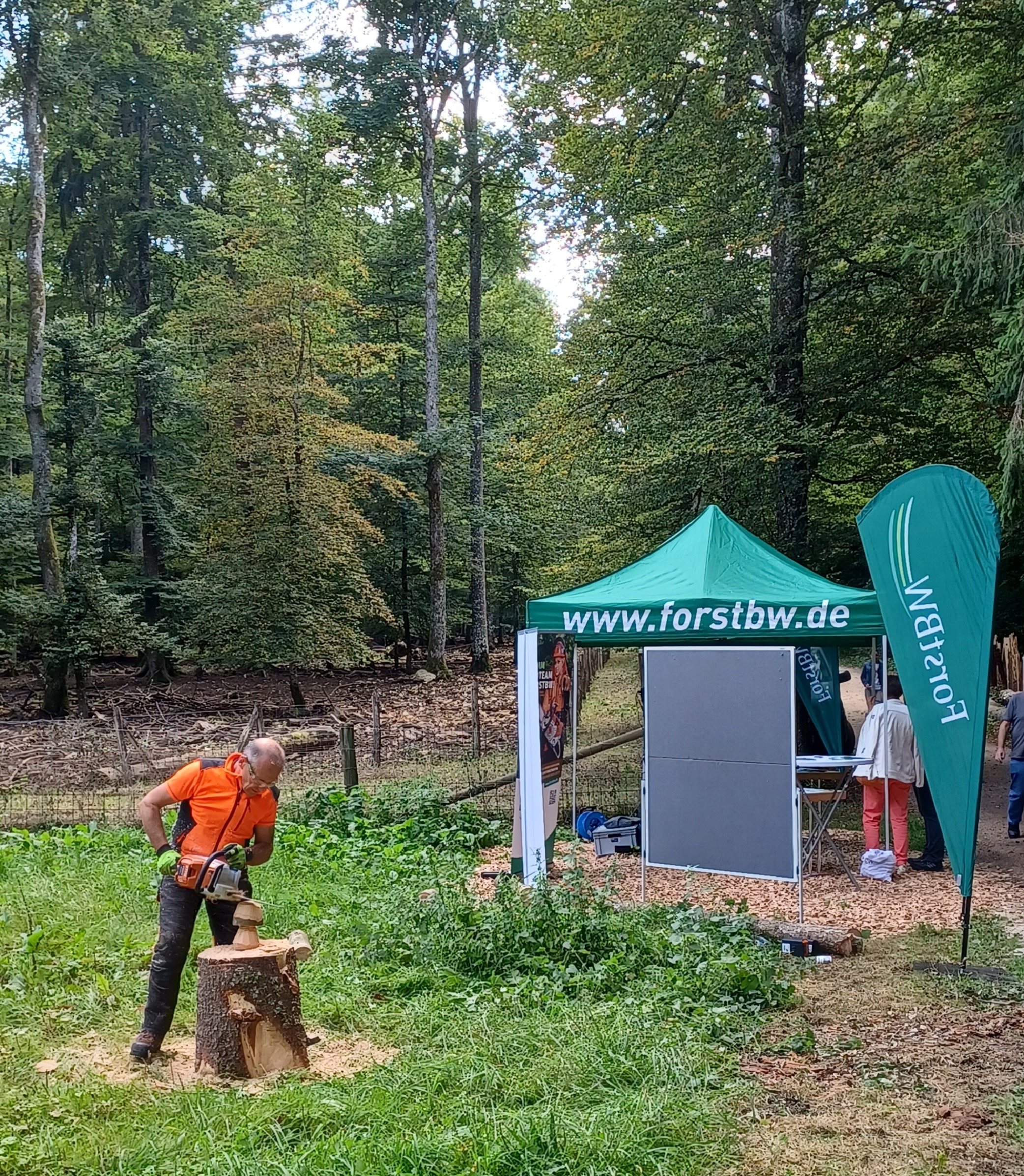 Der Wald bietet Arbeitsplätze, Orte der Bildung, Forschung, Erholung und Gesundheit: Waldbaden, Waldführungen, Vorführungen mit Rückepferden und Forstmaschinen oder künstlerische Vorführungen mit der Säge beim Stand von Forst BW luden zur Wissensvermittlung und zum Verweilen ein. Eine Falknerei stellte ihre Arbeit mit Greifvögeln vor und für die kleinen Besucher gab es viele Möglichkeiten zum Mitmachen, Basteln und erkunden von Flora und Fauna. Neben den vielfältigen Angeboten durch die Aussteller war auch für das leibliche Wohl gesorgt, neben Wildspezialitäten gab es ein breites Angebot an internationalen Speisen. Wir bedanken uns für die gute Organisation und gelungene Veranstaltung in Laichingen.
