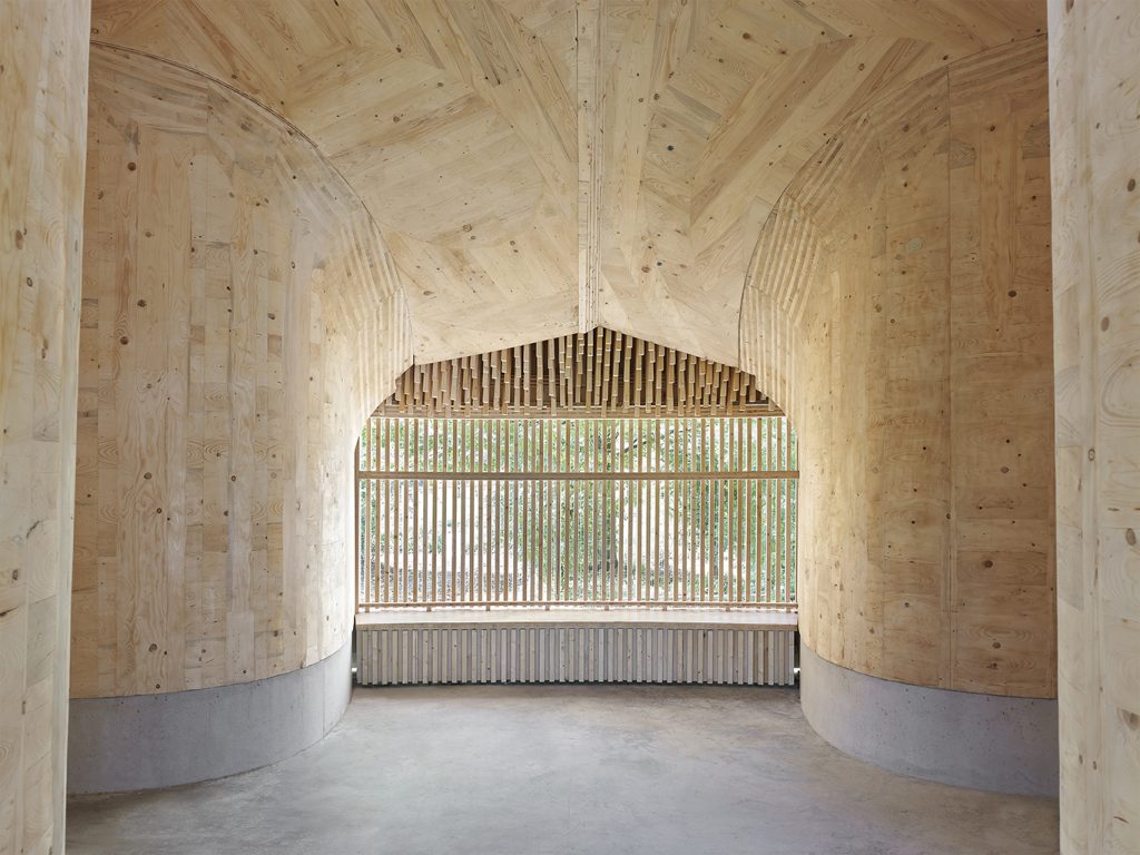 Hallentragwerk aus Schalungselementen der Randbereiche. Foto: proHolzBW