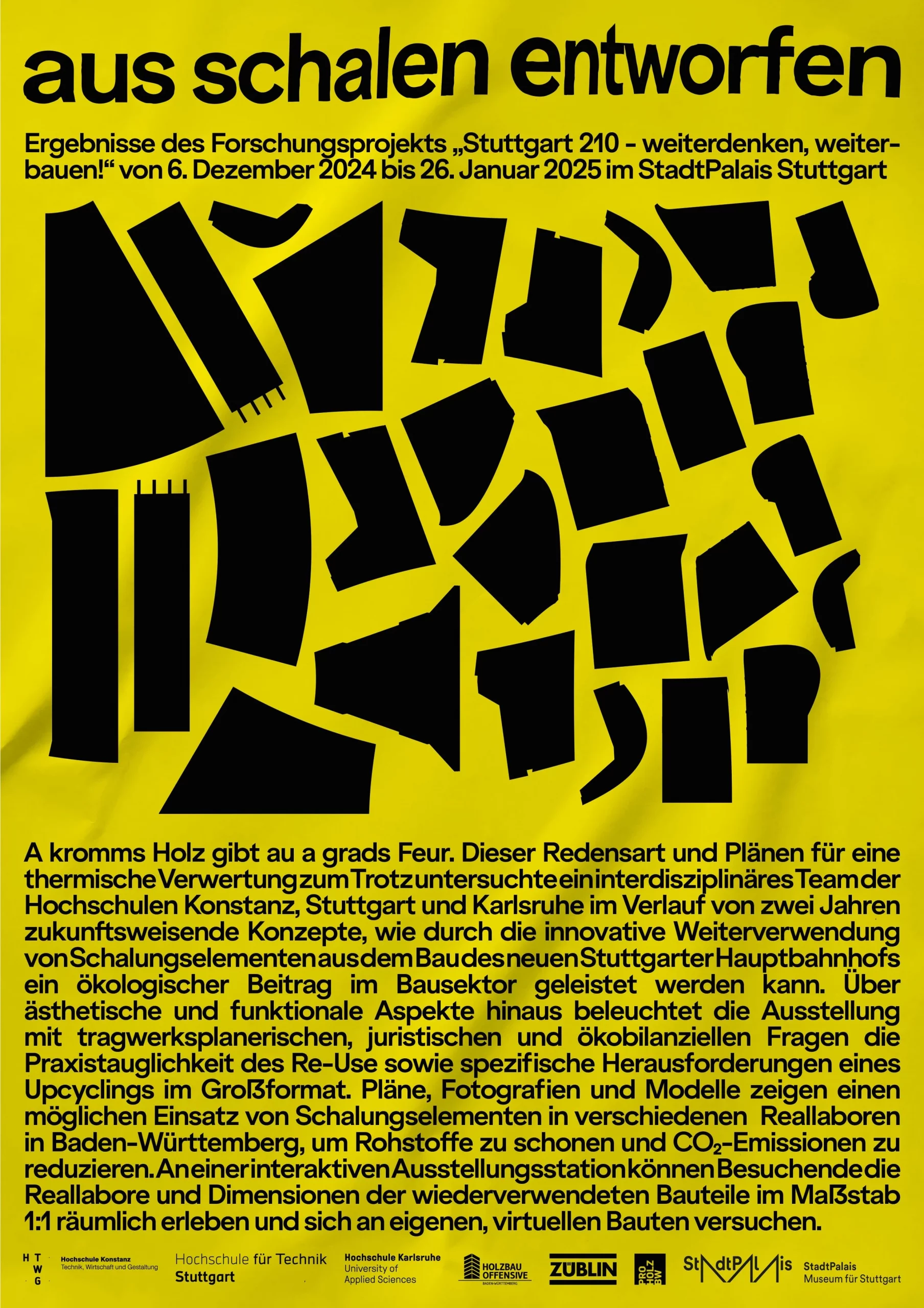 In keinem anderen Wirtschaftsbereich werden ähnlich große Stoffströme umgesetzt wie im Bauwesen. Der Übergang zur Kreislaufwirtschaft ist daher hier besonders relevant. Das Projekt Stuttgart 210 untersucht vor diesem Hintergrund die Verwendung von Bauhilfsmitteln als Primärkonstruktion für neue Gebäude am Beispiel der Schalungselemente des Stuttgarter Hauptbahnhofs (Stuttgart 21) aus blockverleimten Brettsperrholz. Statt thermischer Verwertung wird der stoffliche Erhalt der Ressource Holz und die Wertsteigerung der Elemente im Sinne des Upcycling erforscht. Dazu wurden unterschiedliche Architektur- und Tragwerksentwürfe auf Grundlage einer umfassenden Analyse der Schalungselemente erarbeitet und verglichen. Durch die Vorbereitung und Durchführung von vier Reallaboren setzt sich das Projekt den Anforderungen des realen Bauens aus. Die daraus gewonnenen Erkenntnisse lassen sich wiederum übertragen und in einer Planungshilfe verallgemeinern. Ein prototypisches Gebäude aus zwölf Schalungselementen wurde bereits errichtet und in Betrieb genommen. Für drei weitere Reallabore sind die Elemente übergeben und eingelagert. Das Verwenden komplexer, vorgegebener Bauteile erfordert es, den Entwurfsprozess in der Architektur neu zu denken und zu strukturieren. Üblicher Weise steht die Funktion des Gebäudes am Ausgangspunkt der Entwurfsüberlegungen, zu einem späteren Zeitpunkt folgt eine möglichst entwurfsgerechte Materialisierung. Bei der Verwendung der Schalungselemente dreht sich dieser Prozess um: Die Re-Use-Komponenten als Primärtragwerk prägen von Anfang die Möglichkeiten des Gebäudeentwurfs.