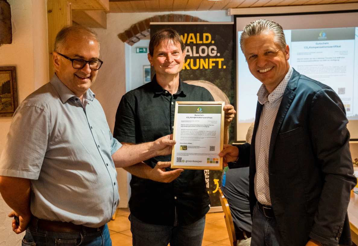 Als Zeichen der Anerkennung erhielt Minister Thorsten Frei im Rahmen des Besuchs ein CO₂-Kompensationszertifikat für 20 Ar Waldfläche. Diese Fläche wird von der Waldservice Ortenau eG dauerhaft gepflegt, markiert und als aktiver CO₂-Speicher betrieben. Es ist ein symbolischer, aber sichtbarer Beitrag zum Ziel, Verantwortung für den Klimaschutz praktisch umzusetzen. Minister Frei zeigte Verständnis für die Herausforderungen und sicherte zu, die Rückmeldungen aus dem Arbeitskreis in die politische Arbeit einzubringen. Er sprach sich klar für Technologieoffenheit und pragmatische Lösungen aus. Für die Waldbesitzer ist das ein wichtiges Signal, aber auch ein Auftrag. Zum Abschluss fasste Kurt Weber, Sprecher des Arbeitskreises, die Haltung der Waldbesitzer deutlich zusammen: „Wir übernehmen Verantwortung seit Generationen. Wir brauchen keine Bevormundung, sondern verlässliche Rahmenbedingungen, Vertrauen statt Kontrolle. Unser Angebot steht. Wir helfen mit, wir gestalten mit und wir liefern weiter den besten Rohstoff, den es gibt – unser klimapositives Holz.