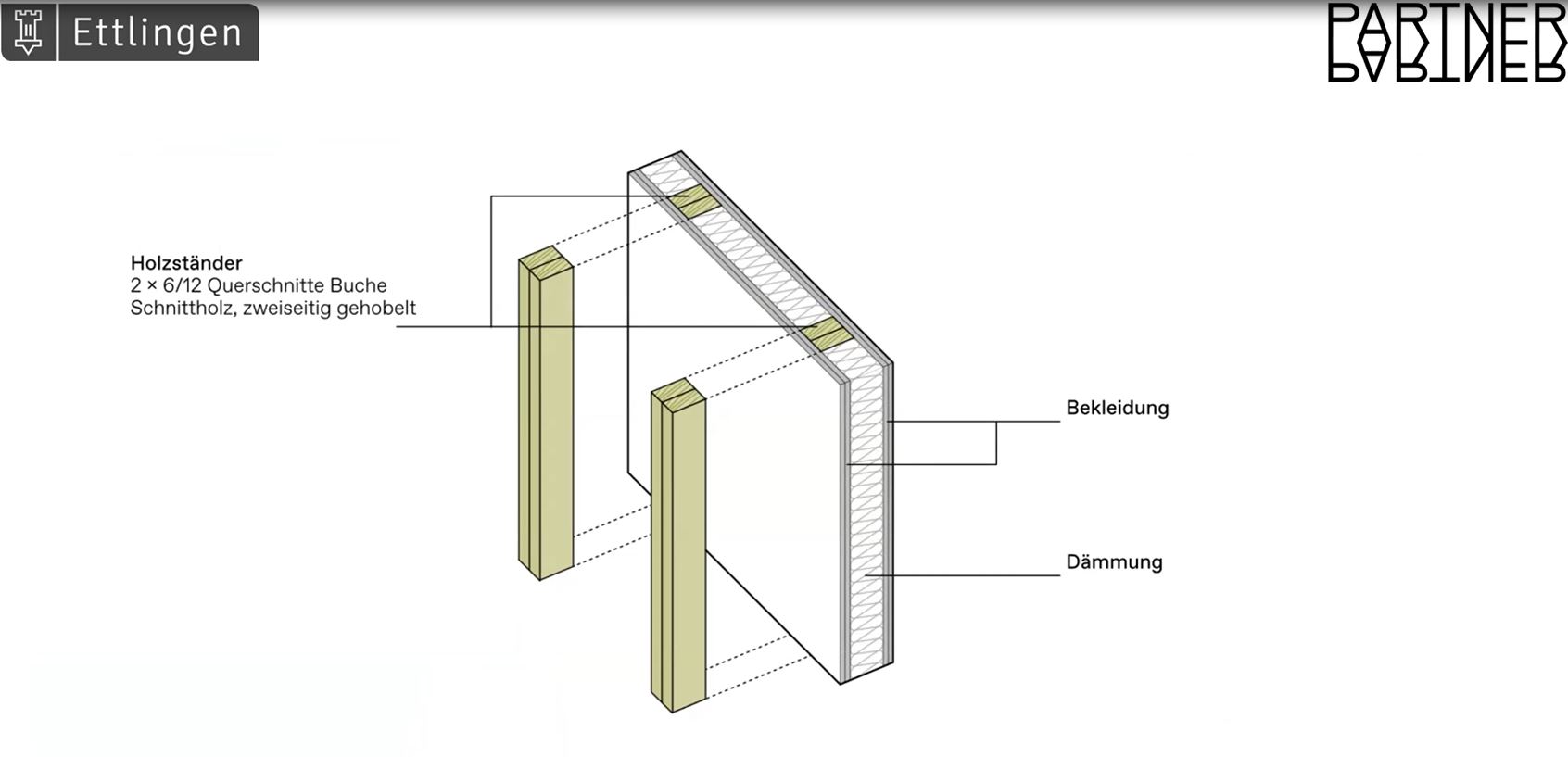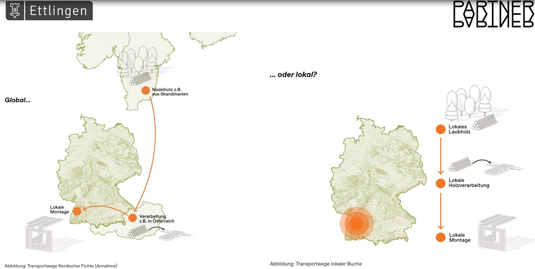 Das Architekturbüro Partner und Partner mit Büros in Berlin und Baiersbronn baut seit vielen Jahren deutschlandweit zu 100 % mit Holz. Günter: „Die Erde ist ein energetisch offenes, aber Rohstoff-geschlossenes System.“ Das Büro setzt daher auf Bestandserhaltung, sekundäre Baustoffe und nachwachsende Rohstoffe. Auch das Ingenieurbüro Wirth Haker in Freiburg hat sich voll und ganz dem Holzbau verschrieben und ist spezialisiert auf integrale Holzbau-Planung, Tragwerksentwürfe und –Analysen. Wassili Meyer-Buck, Leiter des Planungsamtes der Stadt Ettlingen stellte die Holzbauoffensive Ettlingen vor: „Es ist nicht üblich, dass sich eine Stadt um Forschungsprojekte bewirbt, aber wir wollten in dem Bereich einfach weiterkommen.“ Und: „Im Zuge der Klimaentwicklung war für uns in der Stadtplanung die Frage, wie können wir den CO2-Abdruck verkleinern?“ Meyer-Buck: „Wenn wir neue Wohnungen bauen wollen, müssen wir uns über das Thema graue Energie Gedanken machen.“ Alle drei Referenten sind Teil des Forschungsprojekts. Doch schon vor dem Forschungsprojekt gab es intensive Gespräche und fachlichen Austausch zwischen den Beteiligten, in denen die Idee, mit lokalem Holz aus dem Umfeld von Ettlingen Wohnraum zu schaffen, entstanden ist. Im Ettlinger Forst stehen viele Buchen, und der Anteil an Buchen wird in den nächsten Jahrzehnten deutlich zunehmen. So war klar, dass die Buche das Baumaterial der Wahl sein würde. Die Buche speichert nicht nur mehr CO2 als dieFichte; durch die regionale Verarbeitung entfällt emissionsintensiver Transport von Fichtenholz von entfernteren Zulieferern.