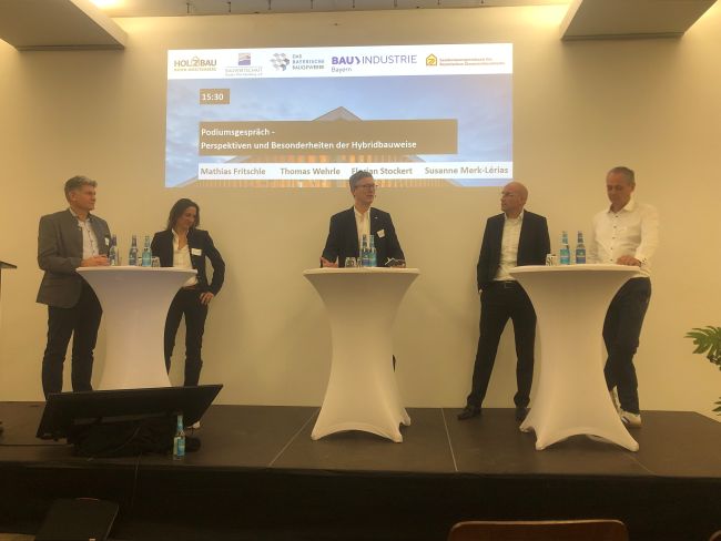 Die anschließende Podiumsdiskussion mit den Referenten Susanne Merk-Lérias, Mathias Fritschle, Thomas Wehrle und Florian Stockert beleuchtete die Perspektiven und Besonderheiten der Hybridbauweise heute – und in der Zukunft.